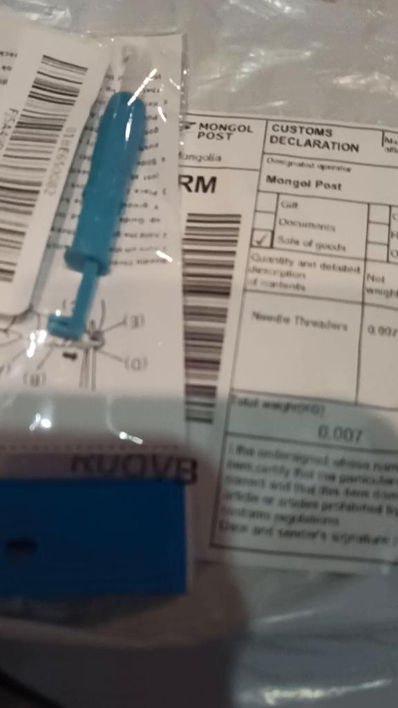 Ich habe ein Paket mit Nadeleinfädelzubehör erhalten. Super und sehr zufrieden. Danke, Jum.