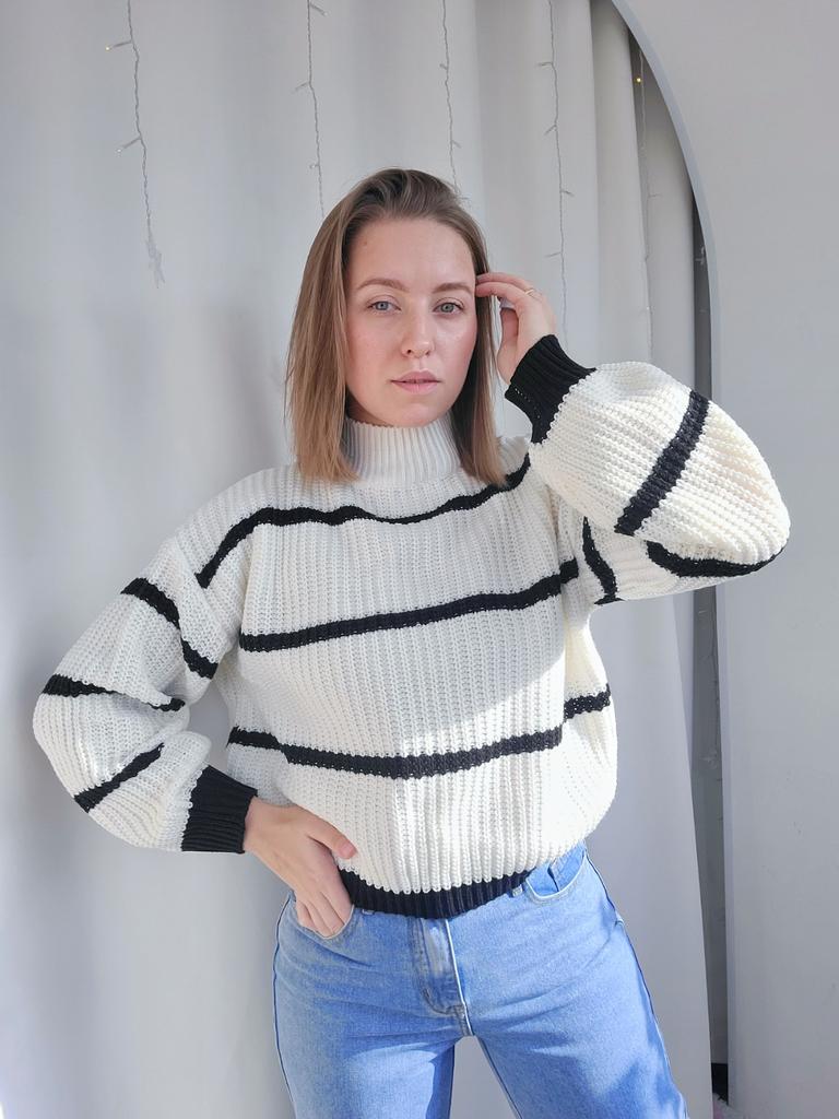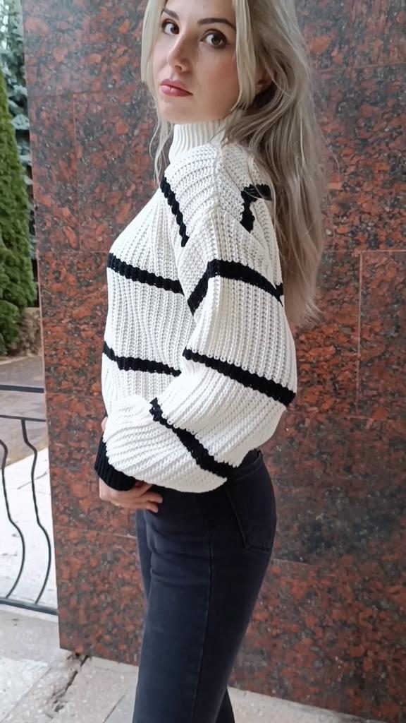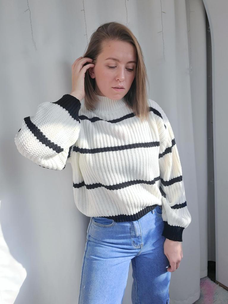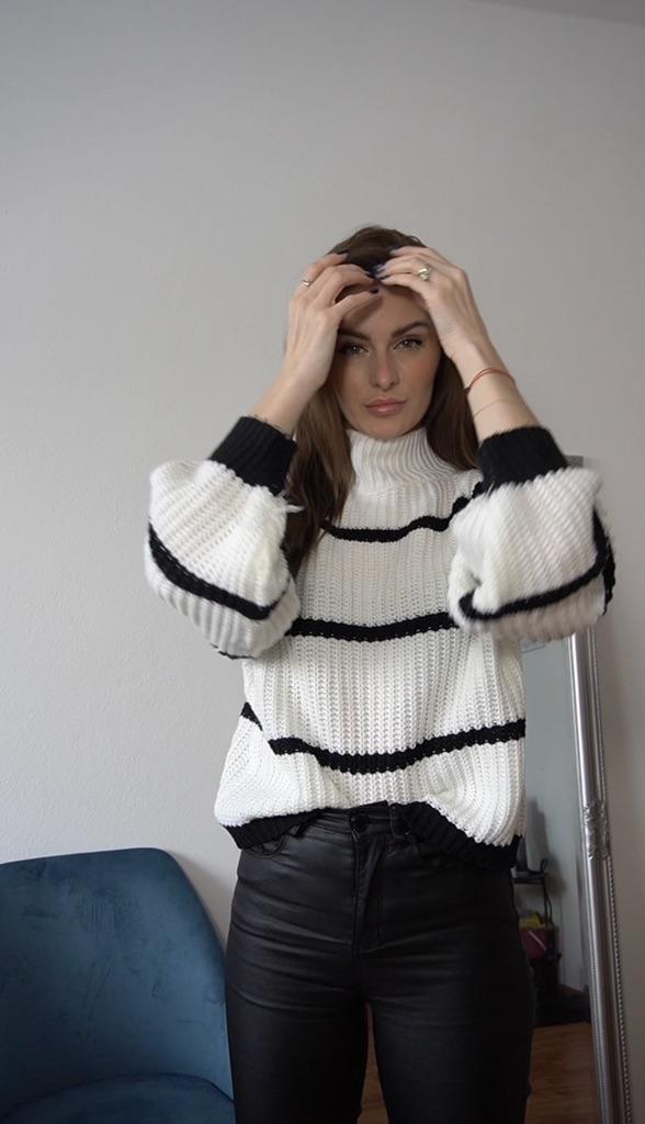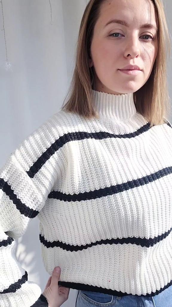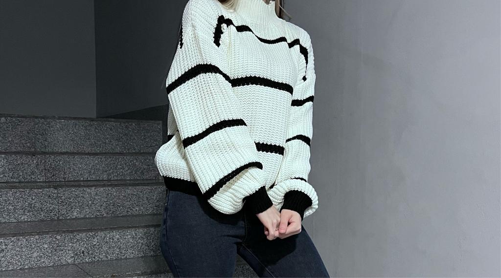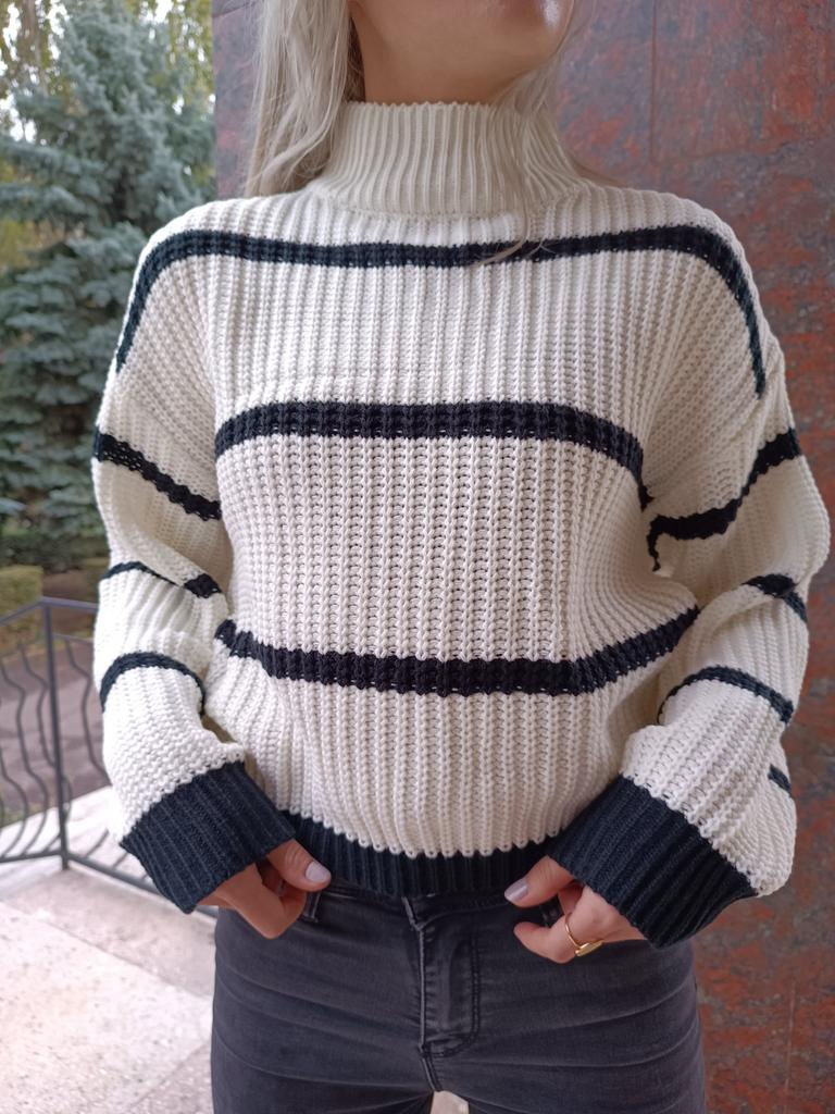 Frauen Herbst Winter Casual Gestreiften Laterne Ärmel Rollkragen Strickpullover Lose Tops S-XL
