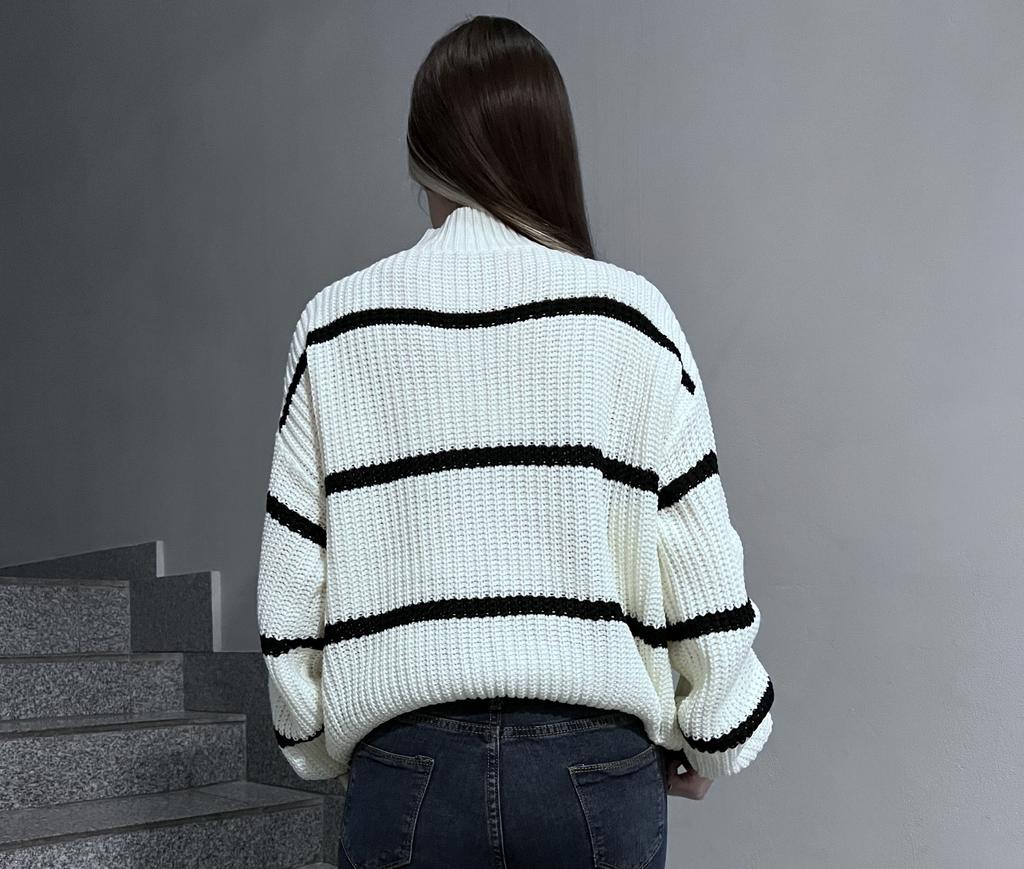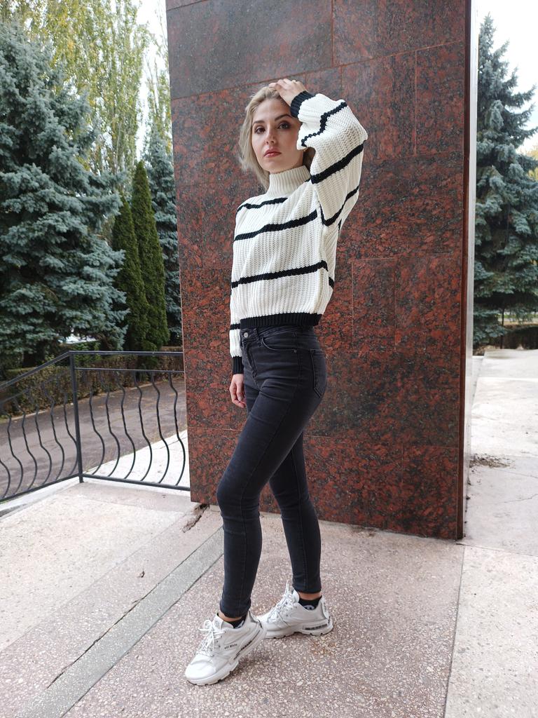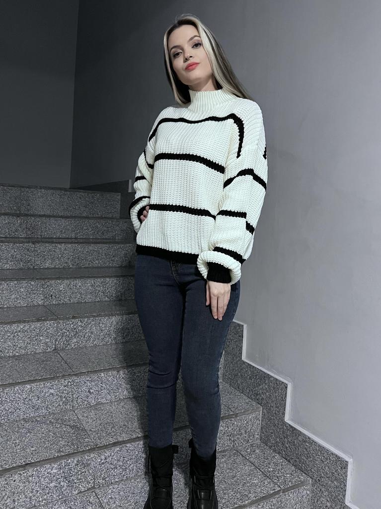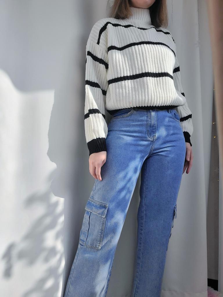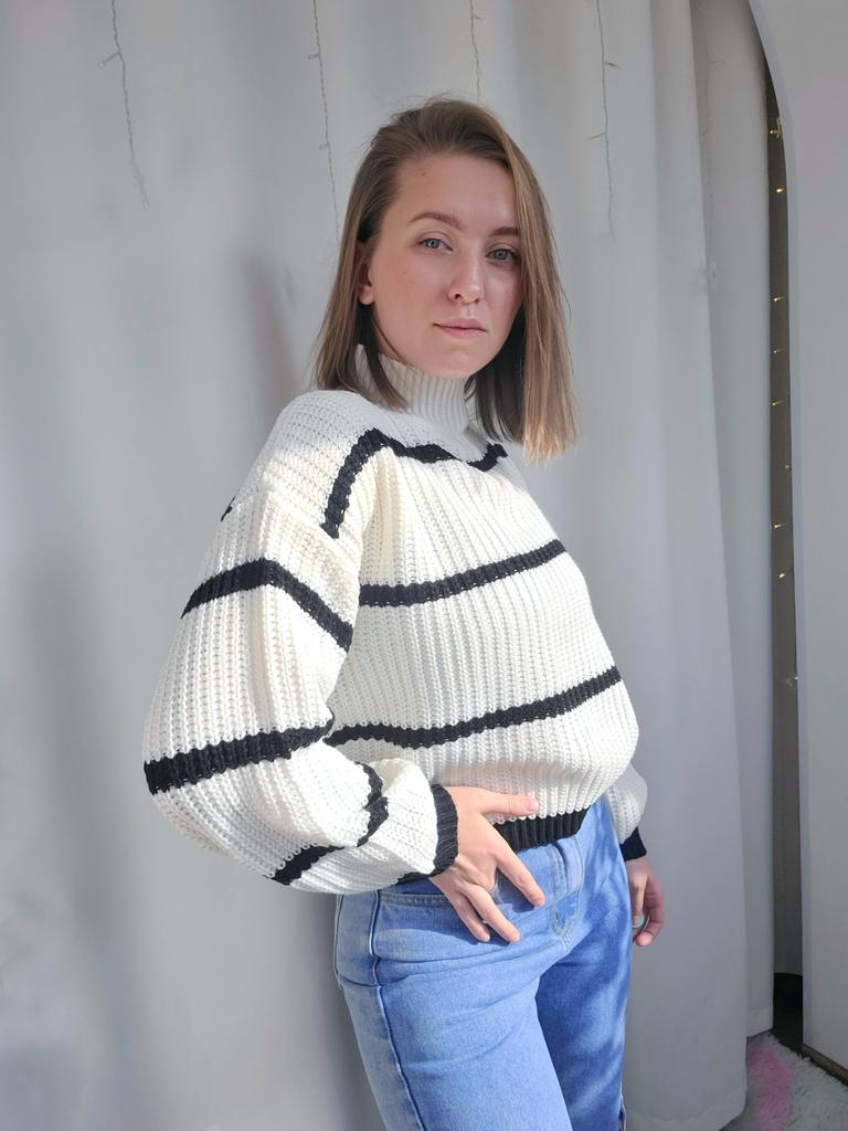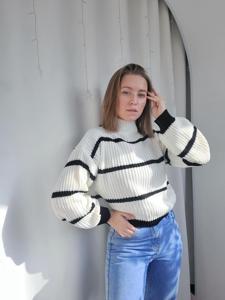 Frauen Herbst Winter Casual Gestreiften Laterne Ärmel Rollkragen Strickpullover Lose Tops S-XL