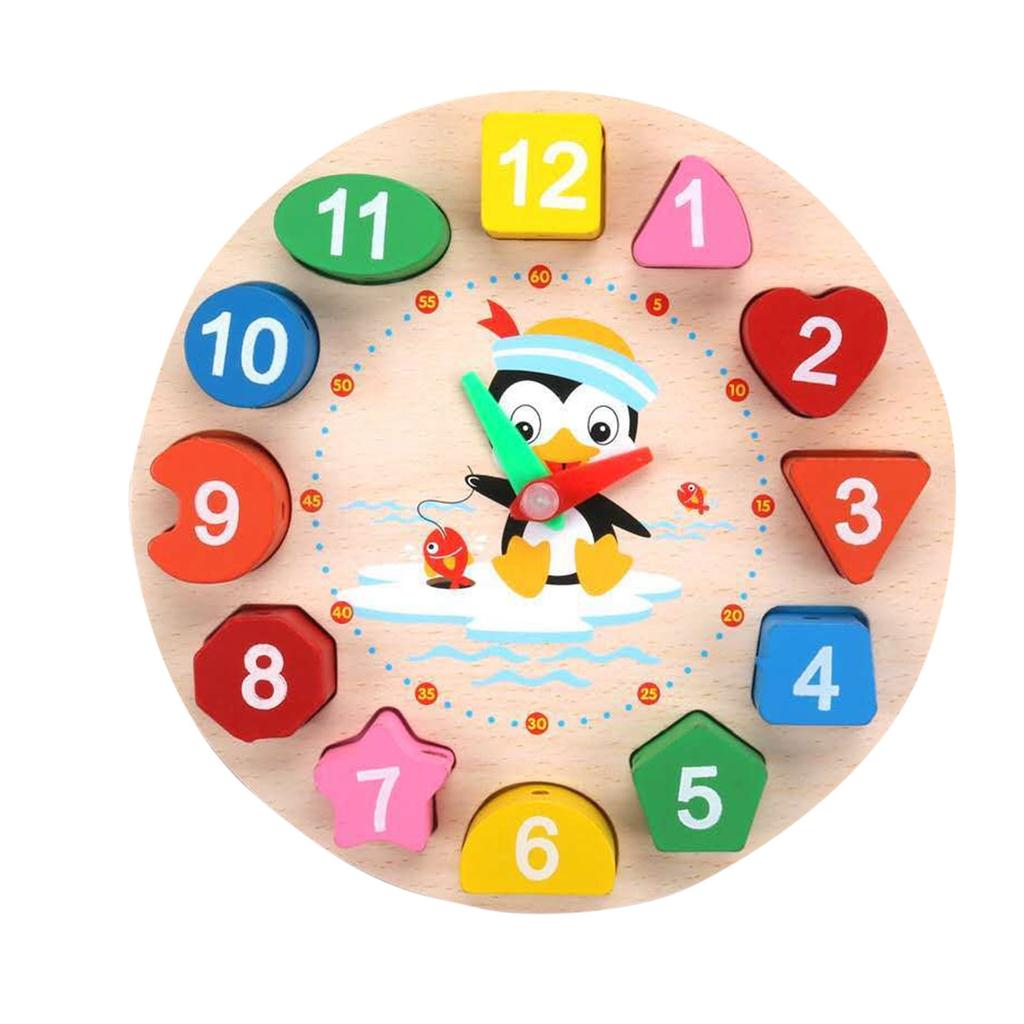 (H0826)Digitale Uhr Geometrische Blöcke Holz Cartoon Pinguin Zeit Zahlen Spielzeug für Kinder