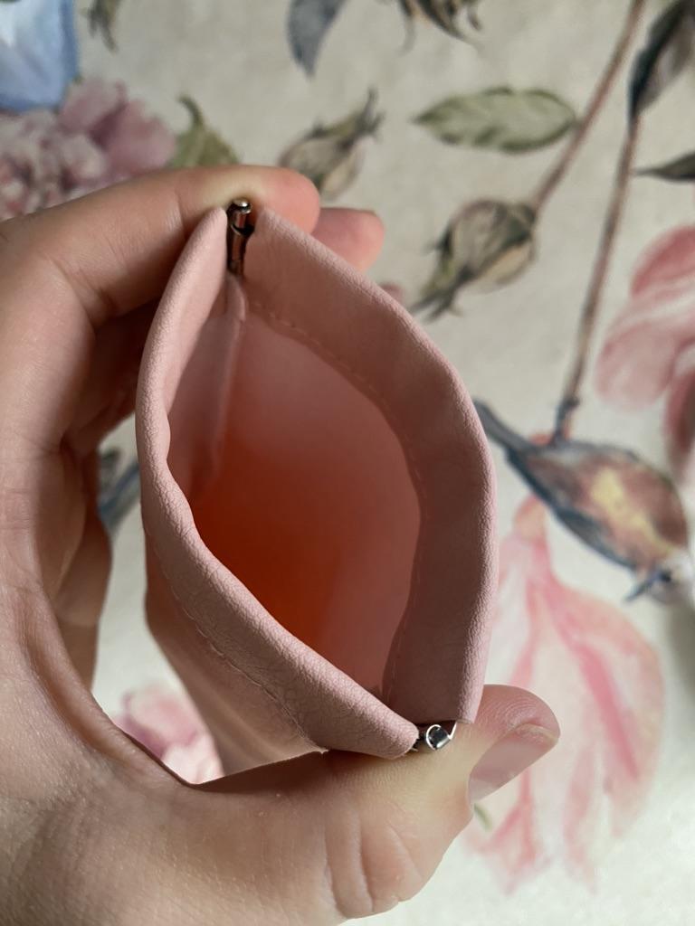 Angenehm anzufassen. Die Farbe ist nicht rosa, wie es geschrieben steht, sondern eher pudrig. Schließt mit Magneten, dicht. Danke an den Verkäufer, das Produkt ist nicht beschädigt.