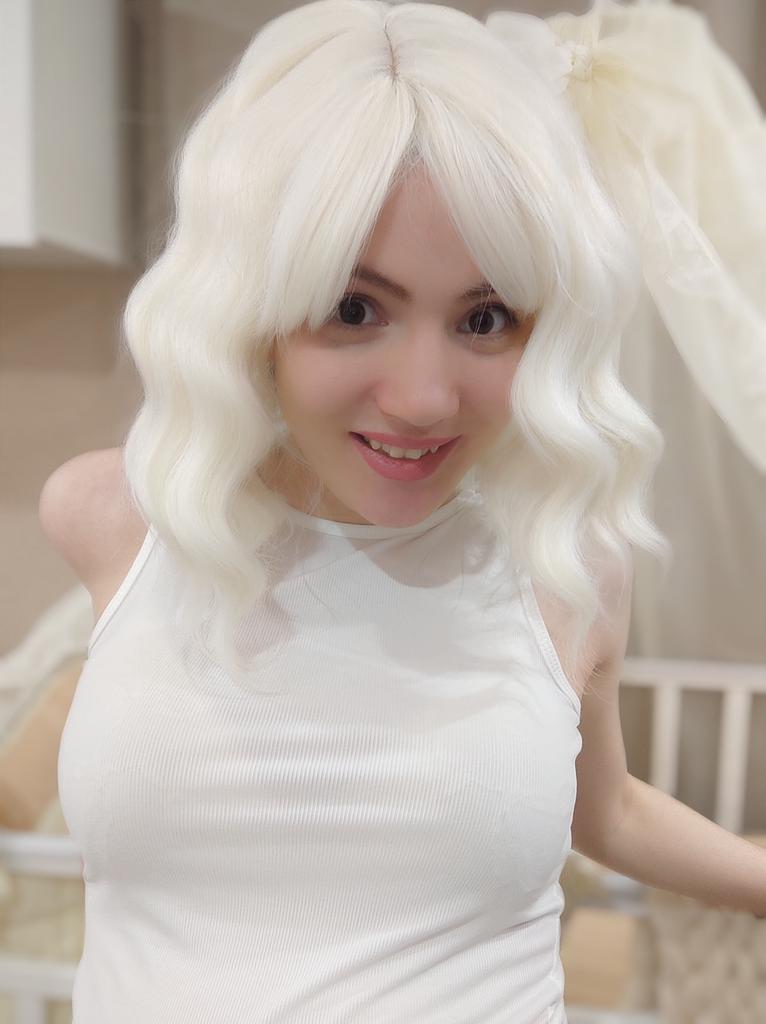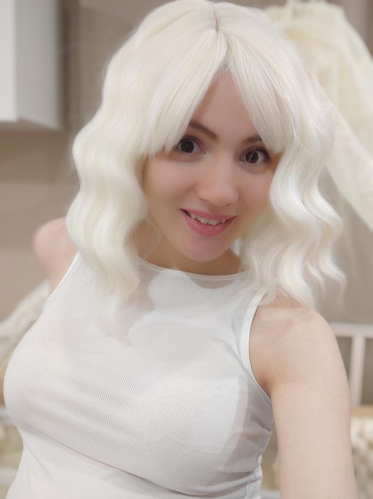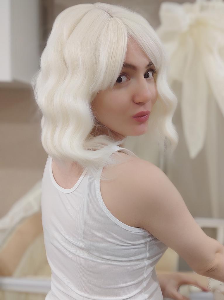 MISSQUEEN Kurze platinblonde Perücken, weißblonde, gewellte Perücke mit Pony, synthetische, mittellange, gewellte Bob-Perücke für den täglichen Gebrauch