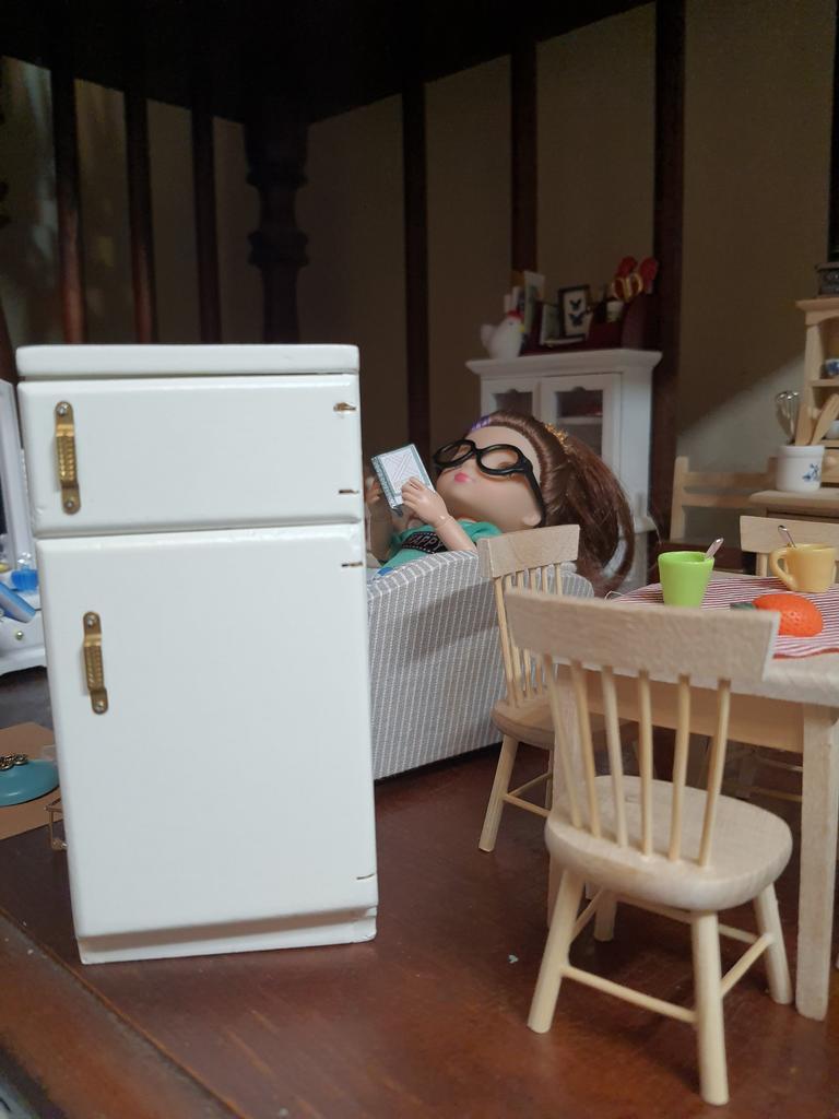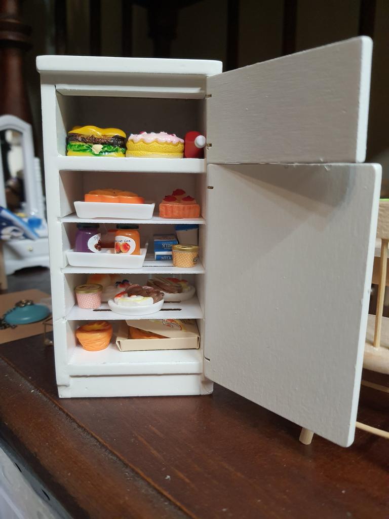 Ein schöner Holzkühlschrank für Puppen 16 cm. Minus - es gibt kein Regal an der Tür, es gibt keine Möglichkeit, eine Tüte Milch hineinzustellen. Die Breite der Regale im Kühlschrank beträgt ca. 18 mm, die Regale selbst sind 4 Die Breite des Gefrierschranks beträgt 21 mm. Beachten Sie dies, wenn Sie zusätzliches Puppenfutter kaufen.
