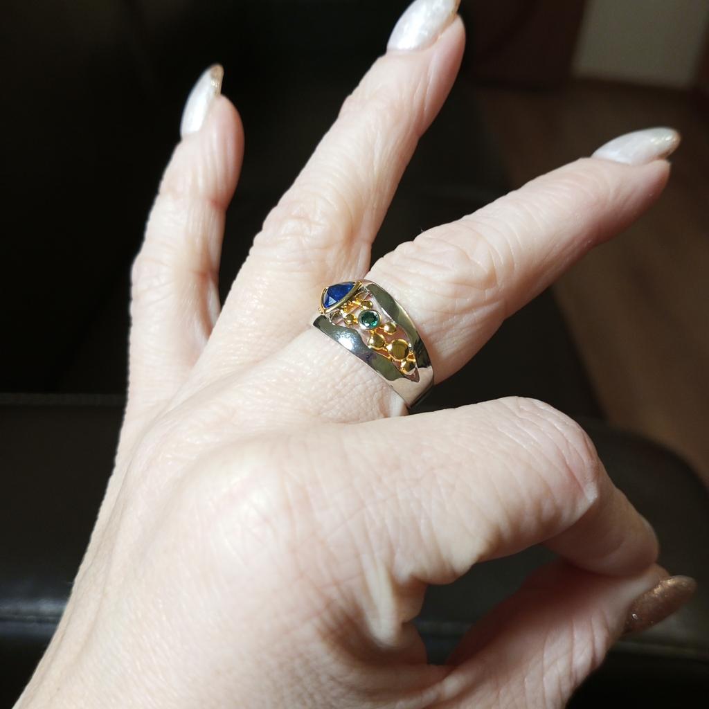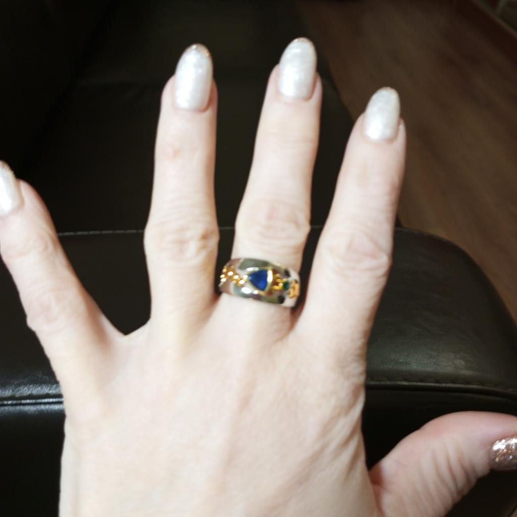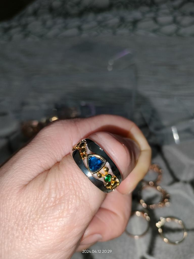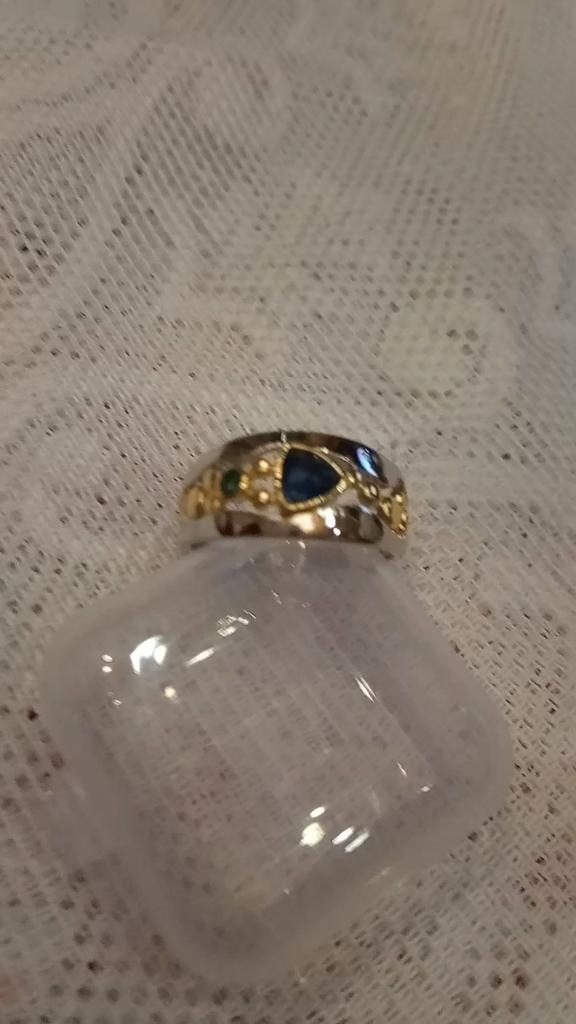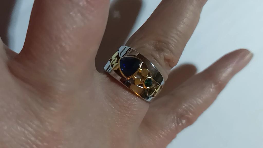Der Ring ist interessant – eine Kombination aus weißen und gelben Metallen, wunderschönen, leuchtend grünen und blauen Steinen ...