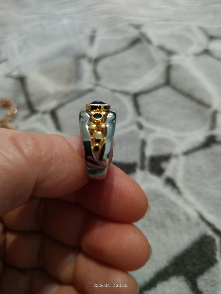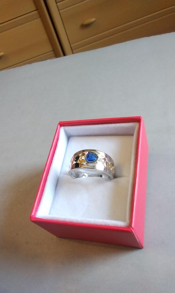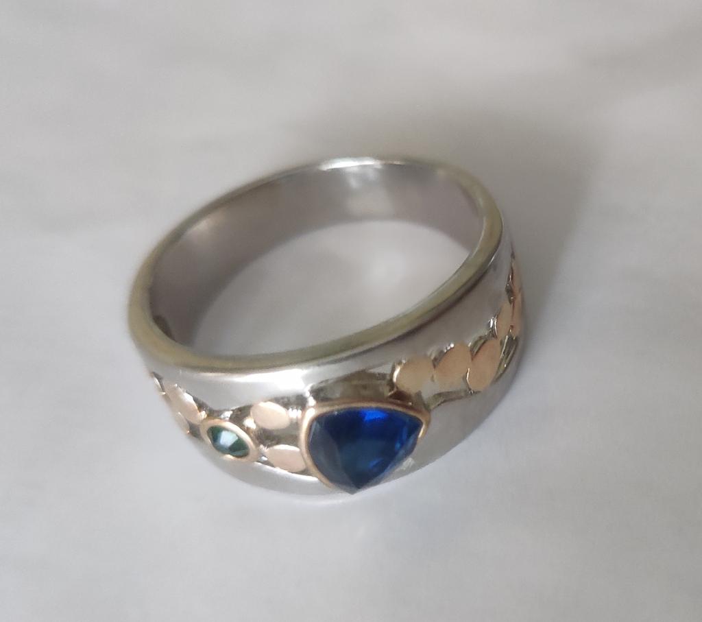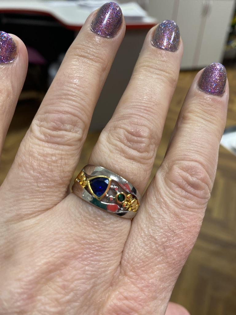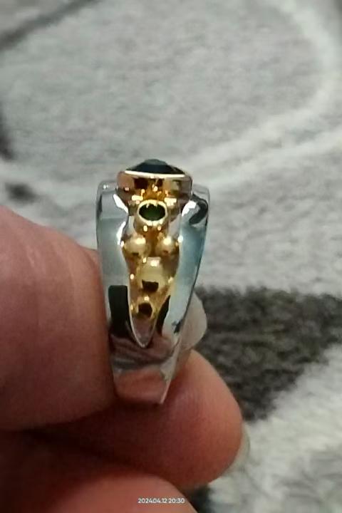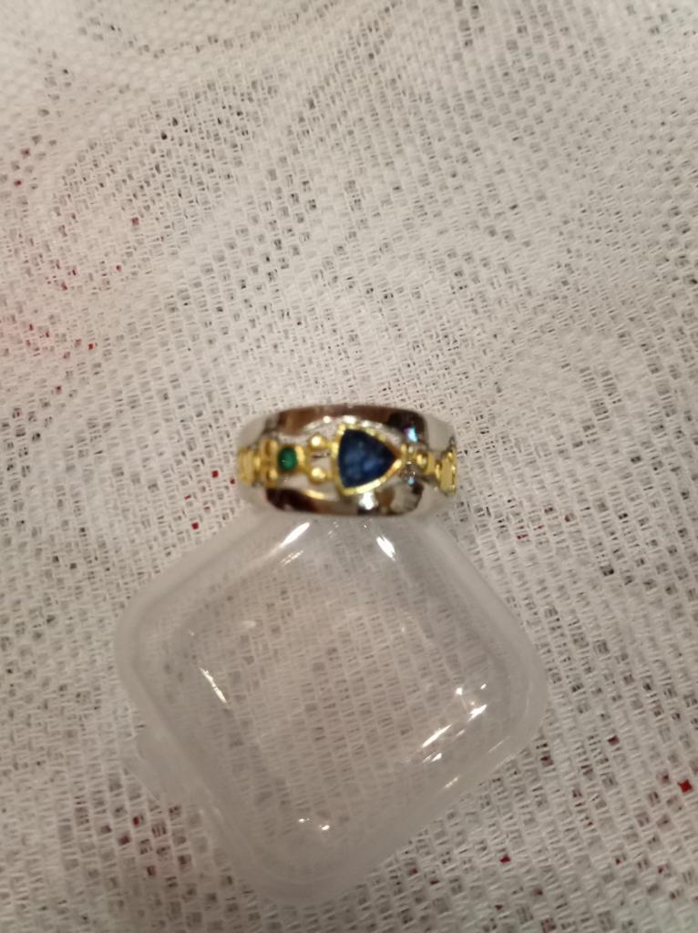 Der Ring ist interessant – eine Kombination aus weißen und gelben Metallen, wunderschönen, leuchtend grünen und blauen Steinen ...
