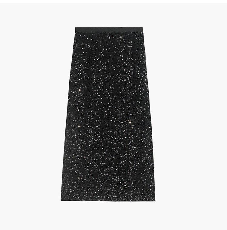 Qooth Herbst Elastische Taille Samt Pailletten Rock Elegante Vintage Sexy Hohe Taille A-linie Split Rock QT1988