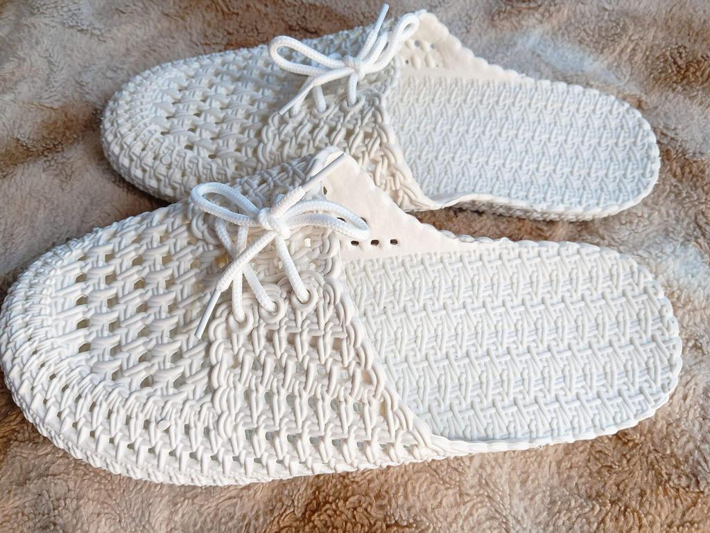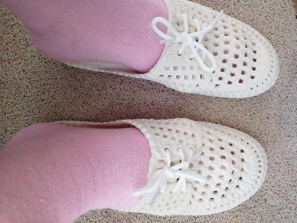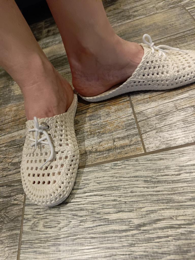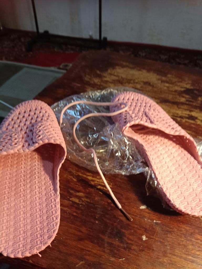 Gummi-Flip-Flops. Weich. Meine Größe ist 37,5. Ein bisschen groß, wie ich wollte. Im Loch.