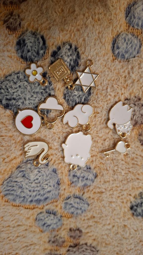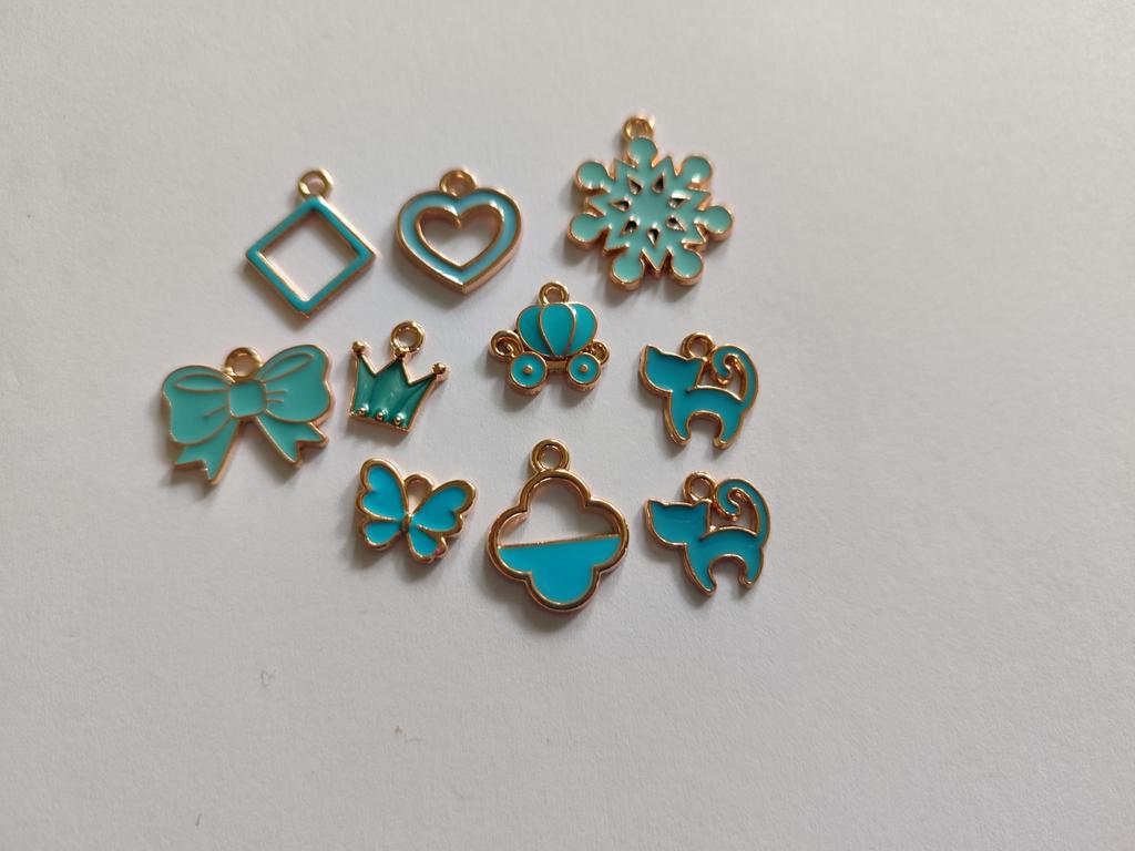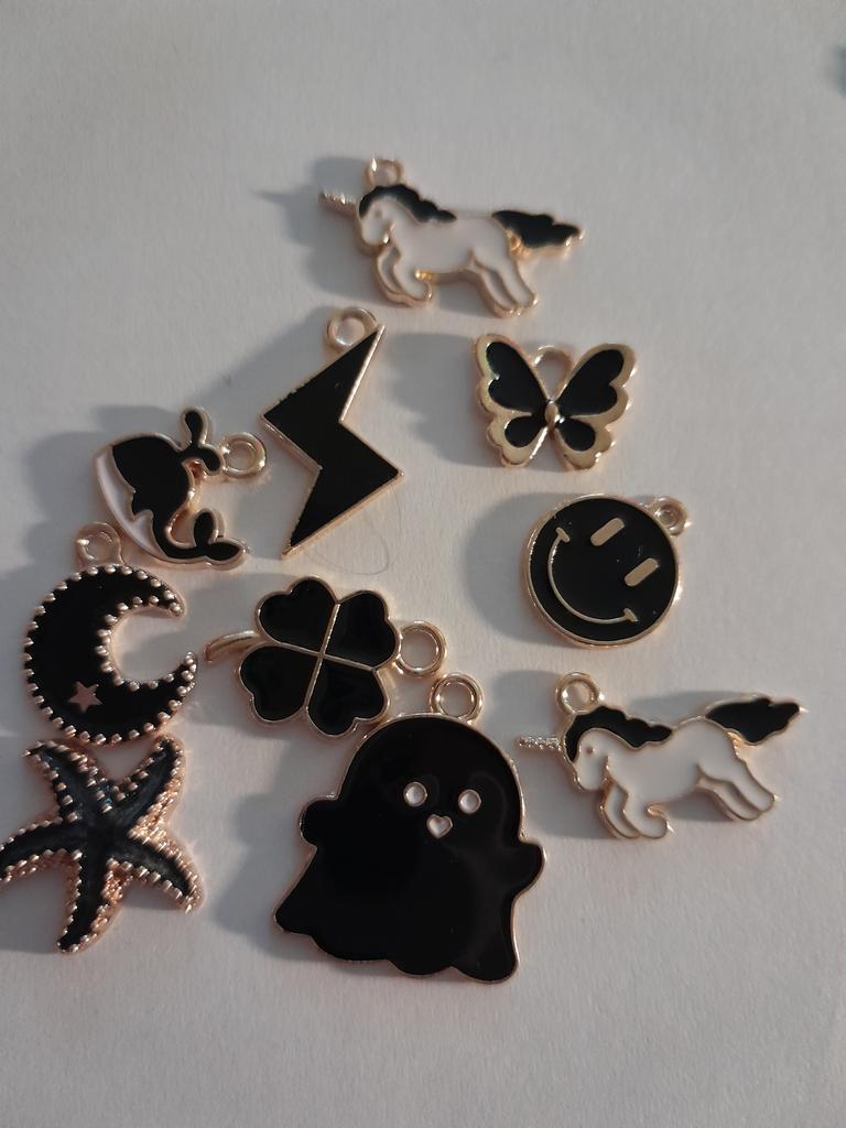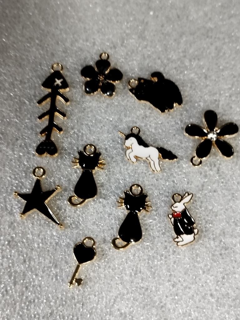 10 Anhänger, zufällig. Der Größte : Katze 1,7x1,6 cm Kuh 1,9x1,7cm Der Kleinste: Schmetterling 1,7x1,0cm Herz 1,8x1,0cm Milota