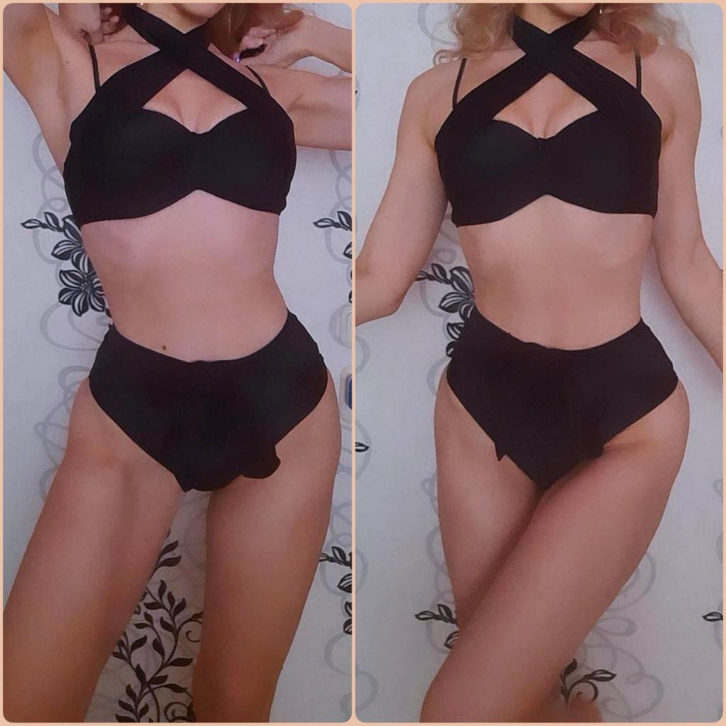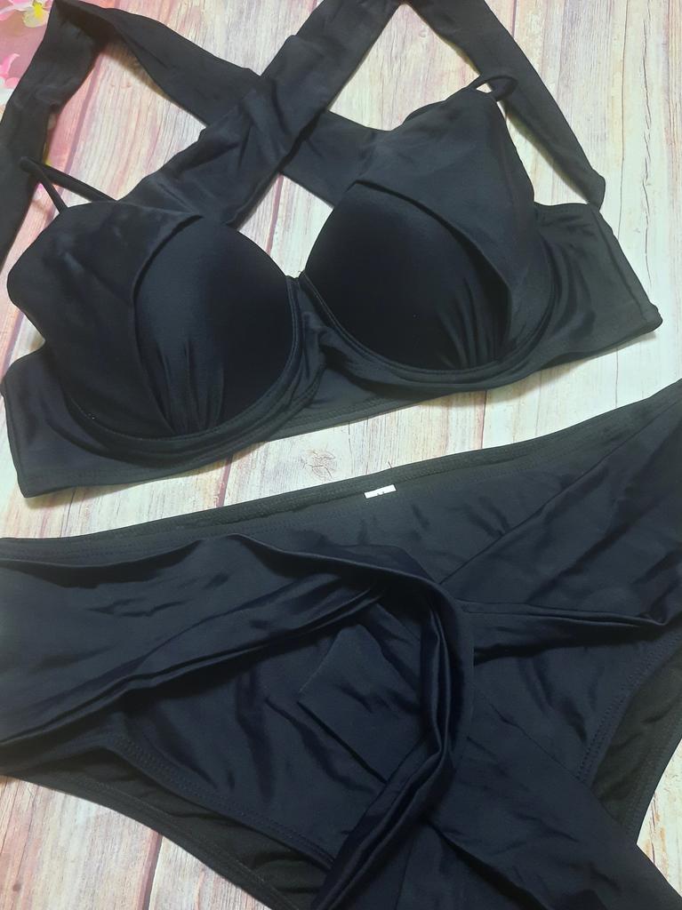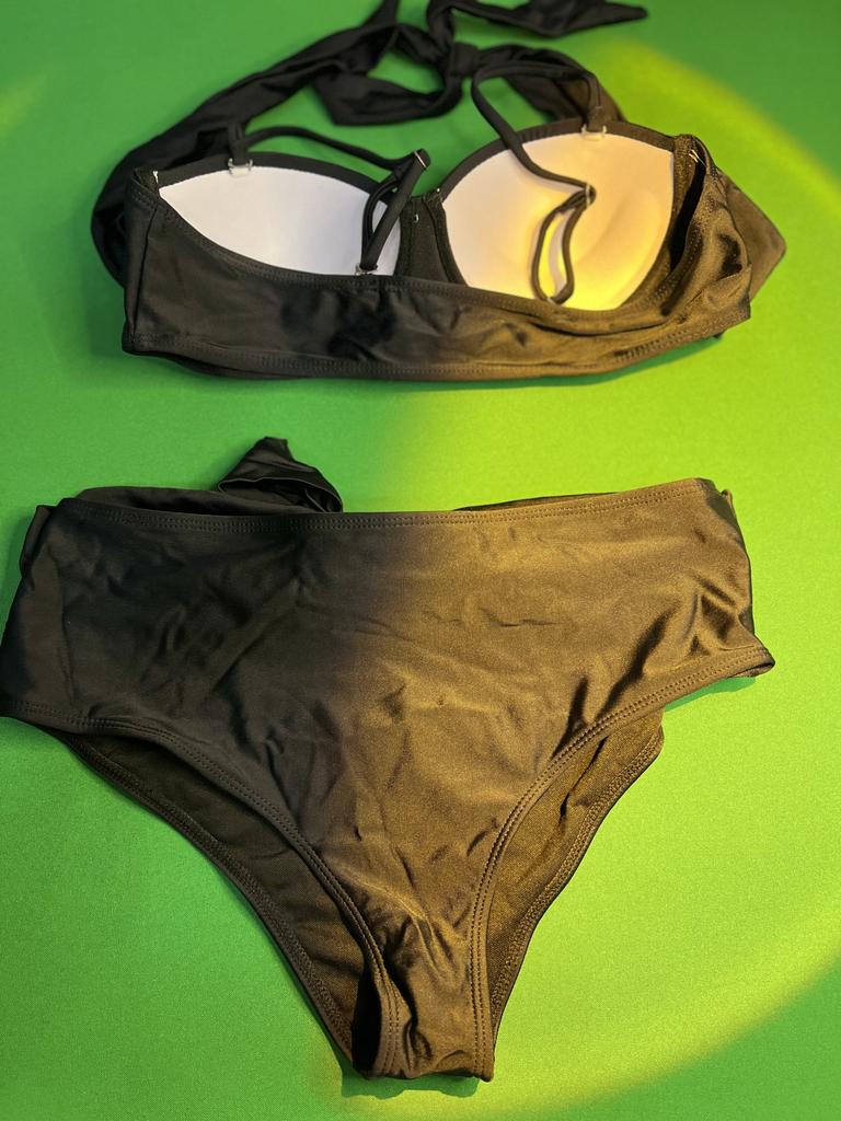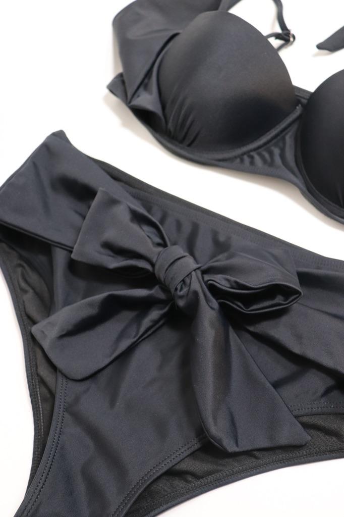 Frauen Dreieck Oversize Split Bikini Set Krawatte Seite G-String Tanga Badeanzug Verband Neckholder Schwarz Einfarbig