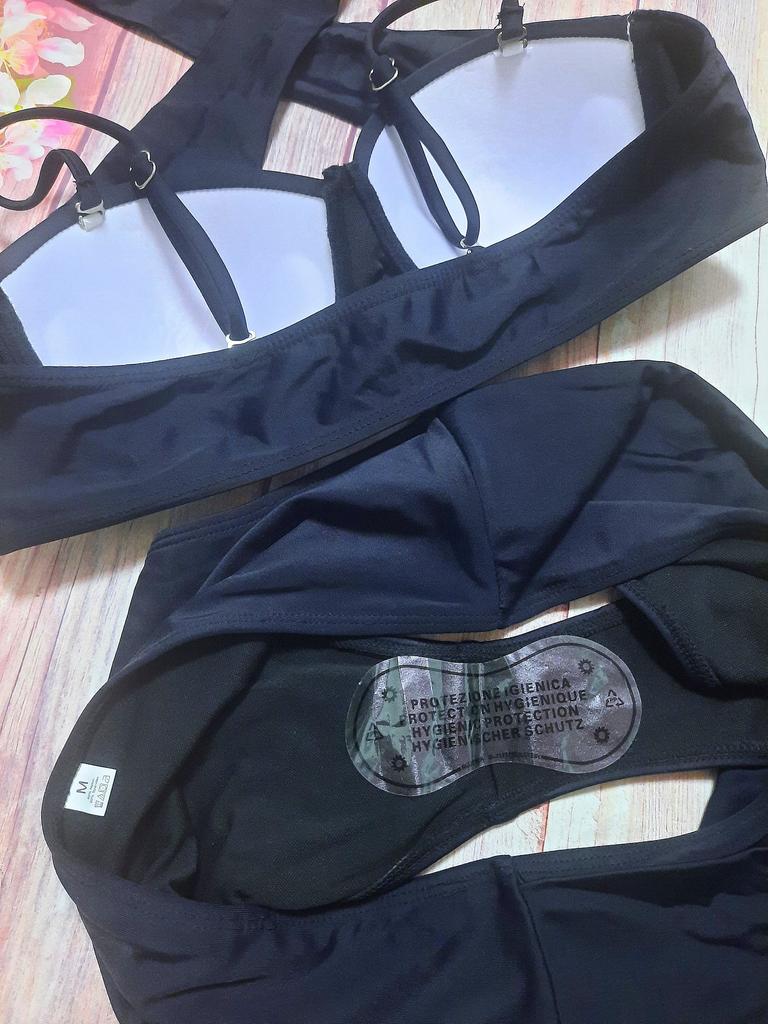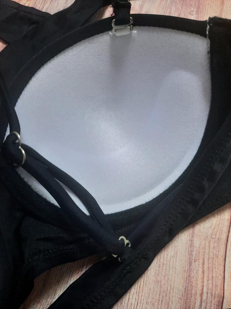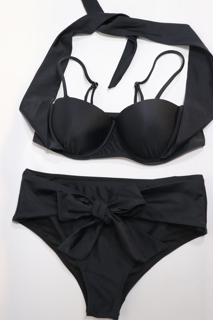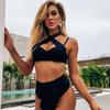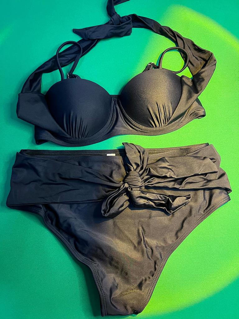 Frauen Dreieck Oversize Split Bikini Set Krawatte Seite G-String Tanga Badeanzug Verband Neckholder Schwarz Einfarbig