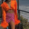 Streetwear Chic Langarm Mit Pelzigen Federn Satin Crop Top Clubwear Vorne Fliege Up Sexy Schlanke Frauen Verband Shirt low Cut