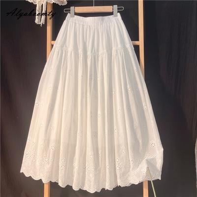 Japanischer Mori Girl Damen-Rock aus weißer Baumwolle mit elastischem Bund, floraler femininer A-Linien-Rock, eleganter Frühlings-Sommer-bequemer Midi-Rock
