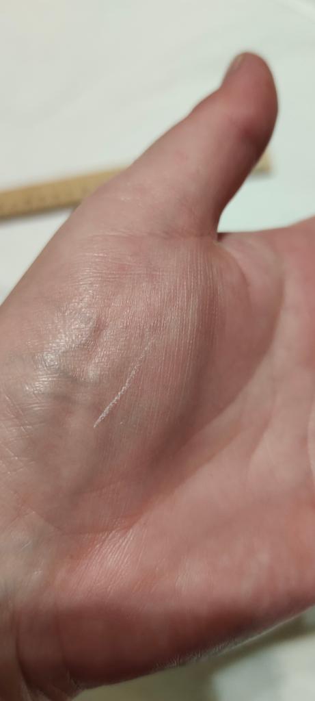 Verpackt in Glimmer. Satte Farbe, trocknet sofort. Die letzten beiden Fotos sind nach dem Abwaschen, die Farbe ist an den Händen fast nicht verblasst. Sehr stabil. Zeichnet nicht auf der Wasserlinie