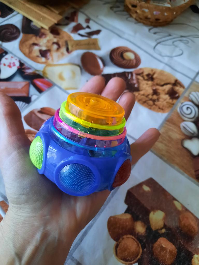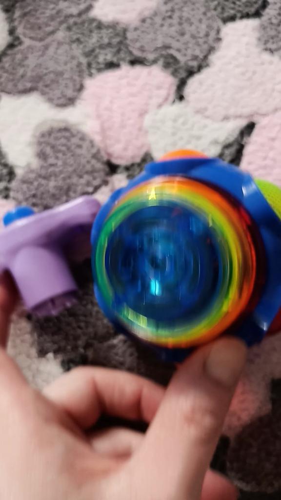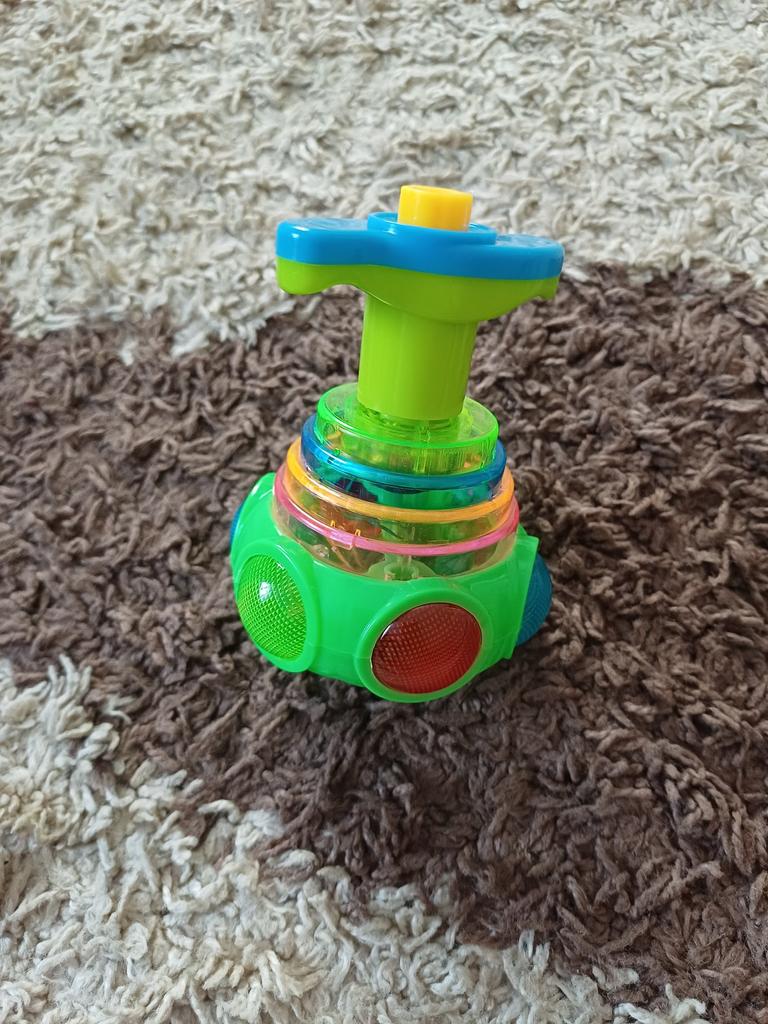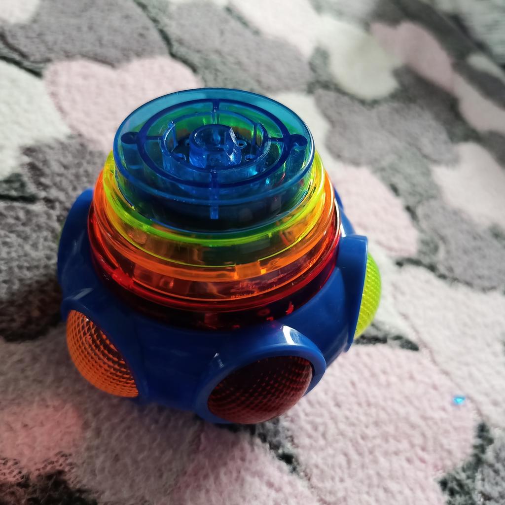 Wie ein Kreisel. Man steckt den Griff in die Kugel, dreht ihn, stellt ihn auf den Boden und drückt den Knopf. Die Kugel trennt sich und dreht sich wie ein Kreisel, mit Musik und heller Beleuchtung. Wenn man sie stoppt, verschwinden Musik und Farbe. Einen Stern abgezogen, weil nicht jedes Kind die Spieluhr selbst aufziehen kann