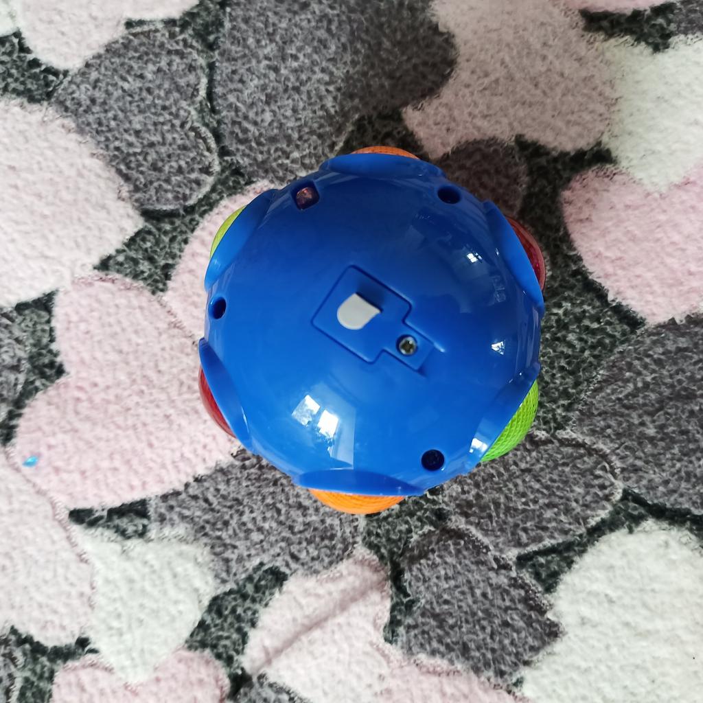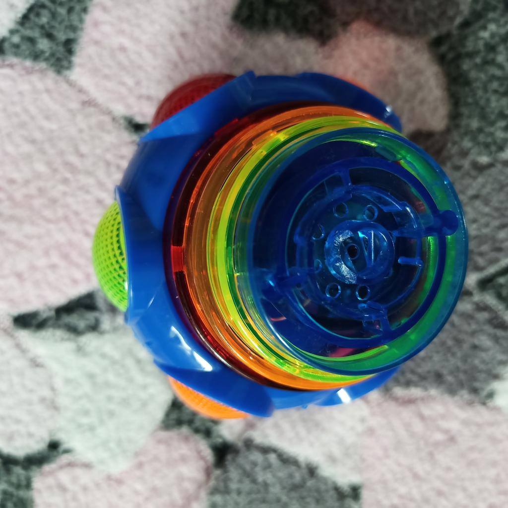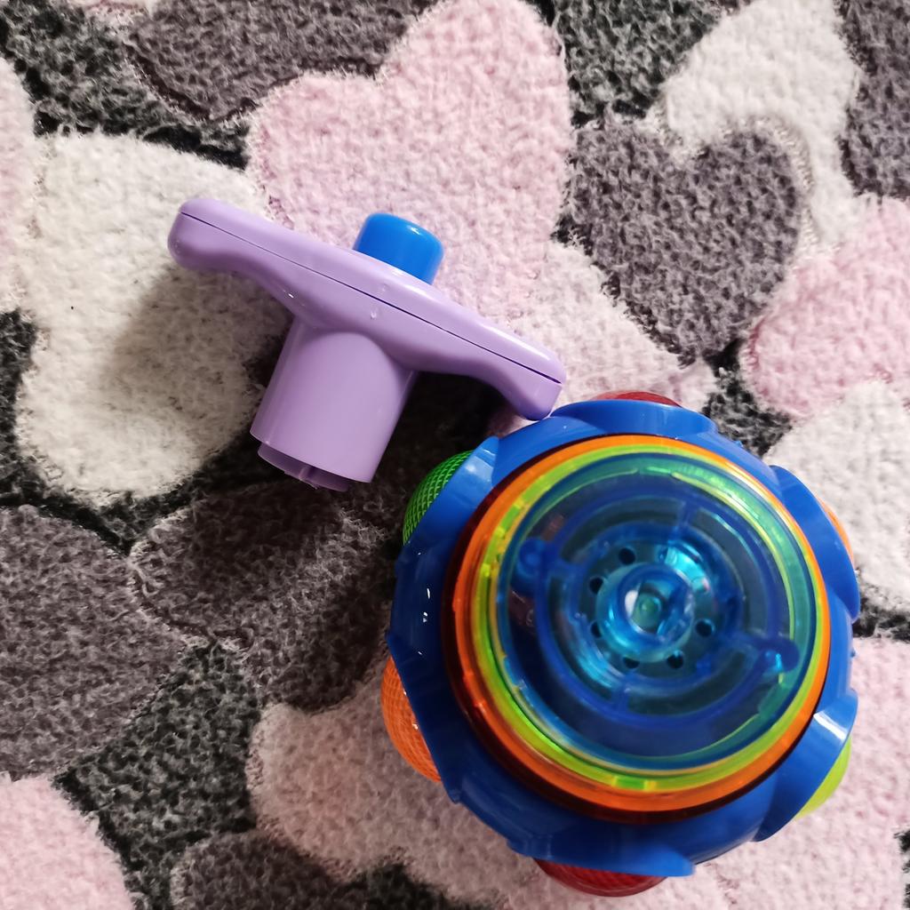 Wie ein Kreisel. Man steckt den Griff in die Kugel, dreht ihn, stellt ihn auf den Boden und drückt den Knopf. Die Kugel trennt sich und dreht sich wie ein Kreisel, mit Musik und heller Beleuchtung. Wenn man sie stoppt, verschwinden Musik und Farbe. Einen Stern abgezogen, weil nicht jedes Kind die Spieluhr selbst aufziehen kann