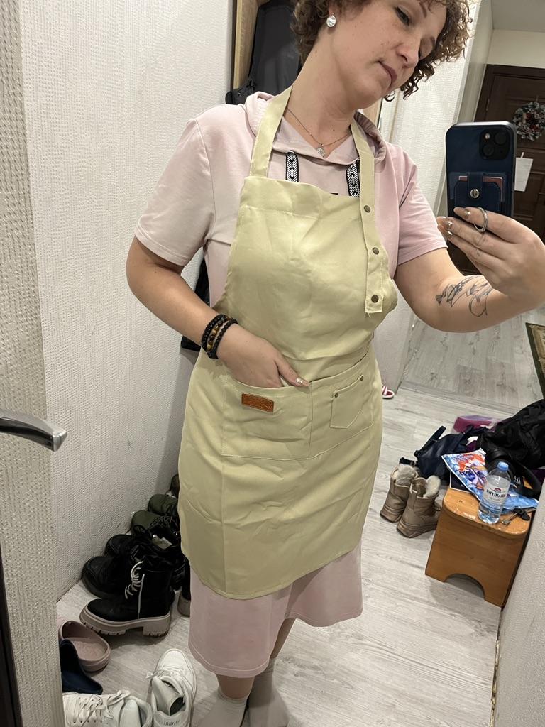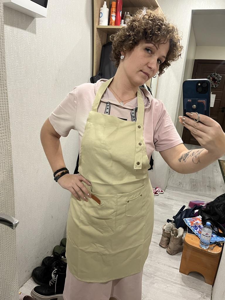 Die Schürze ist bequem. Aus synthetischem Baumwollstoff. Einstellbar auf jede Größe. Aber die Fäden stehen an manchen Stellen ab und die seitlichen Bänder sind schief angenäht. Prapda fest genäht. Das heißt, für so viel Geld ist die Schürze normal. Mal sehen, wie es bei der Arbeit sein wird. Danke schön.