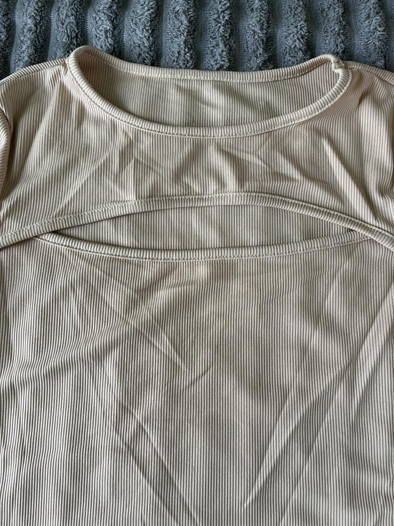 Kam mit einem Loch. Der Ausschnitt ist nicht durchdacht und das Top rutscht nach unten, sodass der BH sichtbar wird.