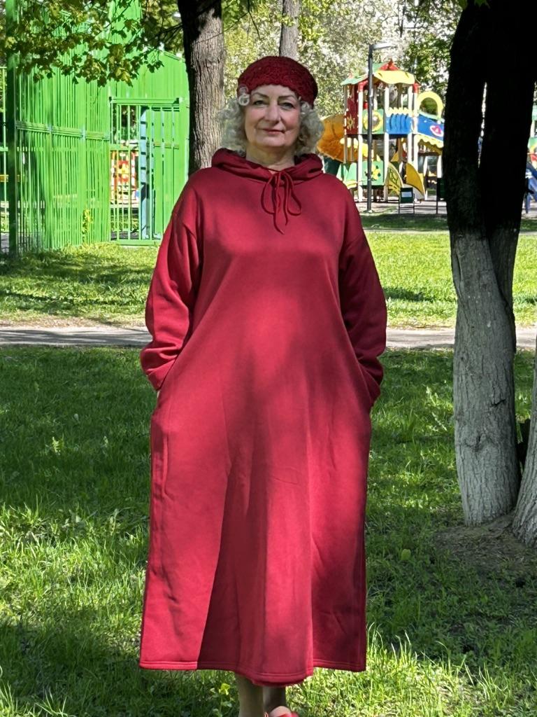 Ich habe die Mütze zum burgunderfarbenen Sweatshirt-Kleid genommen, sie sieht interessant aus!)