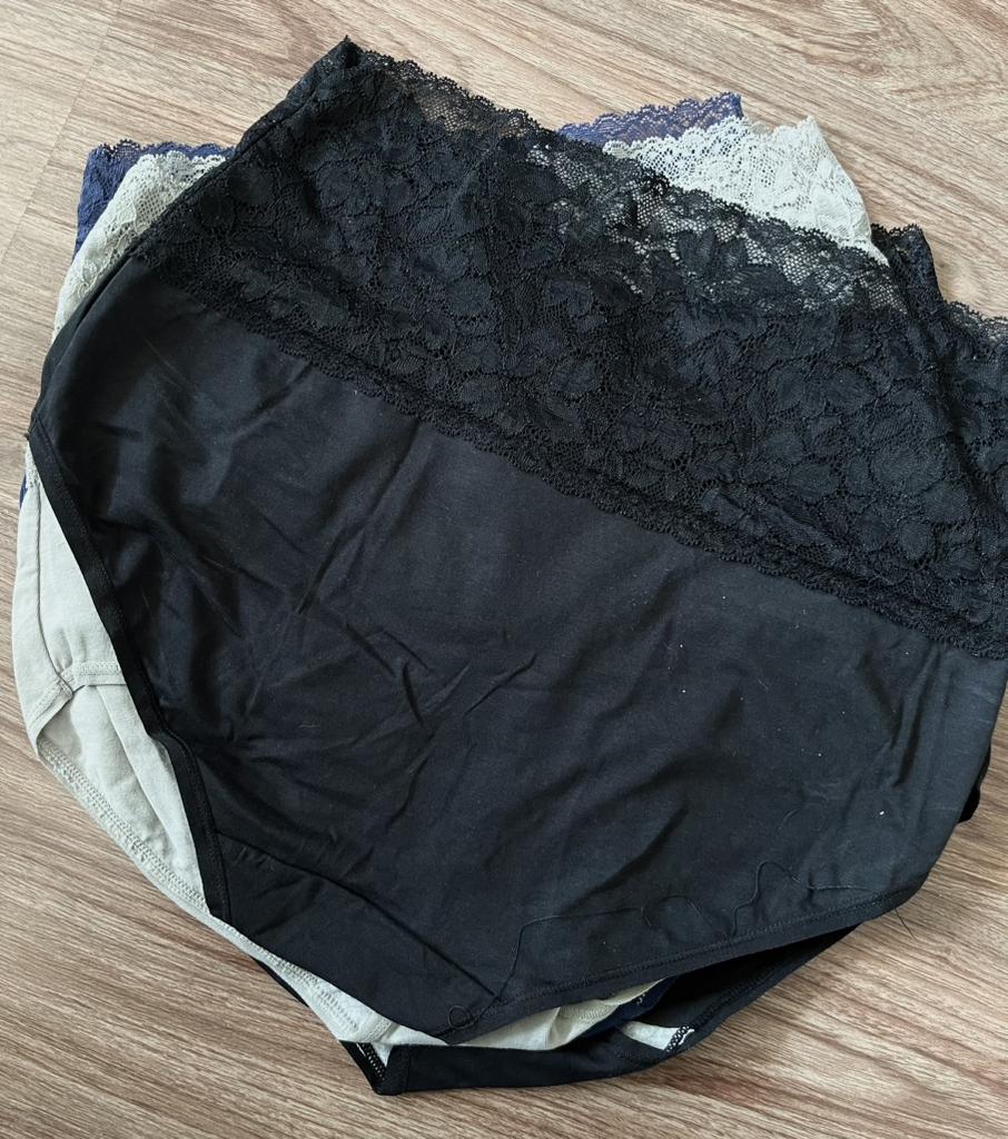 Spitzenunterwäsche mit hoher Taille, ich habe ein 5er-Set bekommen. Schöne Farben, sehr gute Passform, schön und bequem. Der Stoff ist Baumwolle und Elasthan. Ich habe Größe XL auf 85/103 cm bestellt, sie sind sehr dehnbar. Schneller Versand und tolle Verpackung. Glücklich Einkaufen!