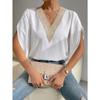 Damen Elegant Jugendlich Büro Dame Hemd 2023 Frühling Mode Spitze V-Ausschnitt Chiffon Bluse Halber Kurzer Ärmel Sommer Top 25837