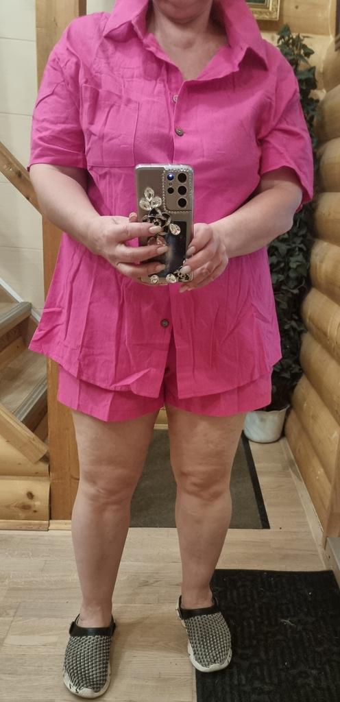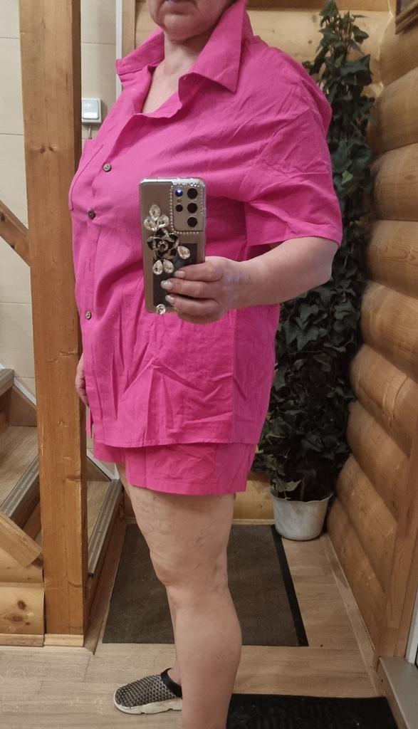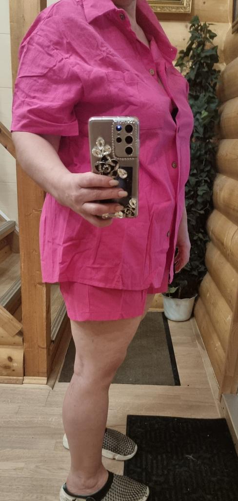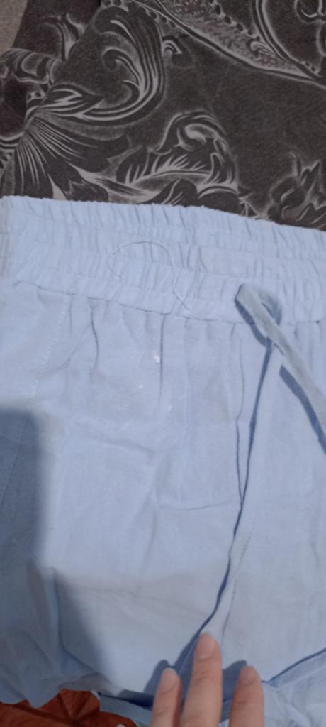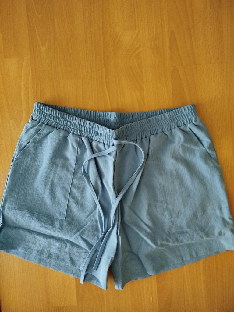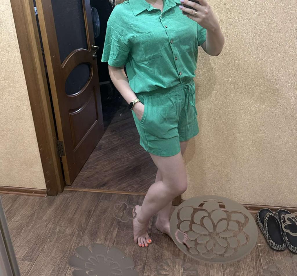 Ich habe Größe 50 XL genommen - gute Größe, aber es gibt einen großen Nachteil: sehr kurze Shorts. Es wird gut für junge Mädchen sein. Das Material ist naturbelassen, ähnlich wie Baumwolle.