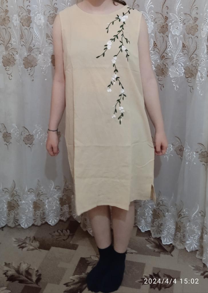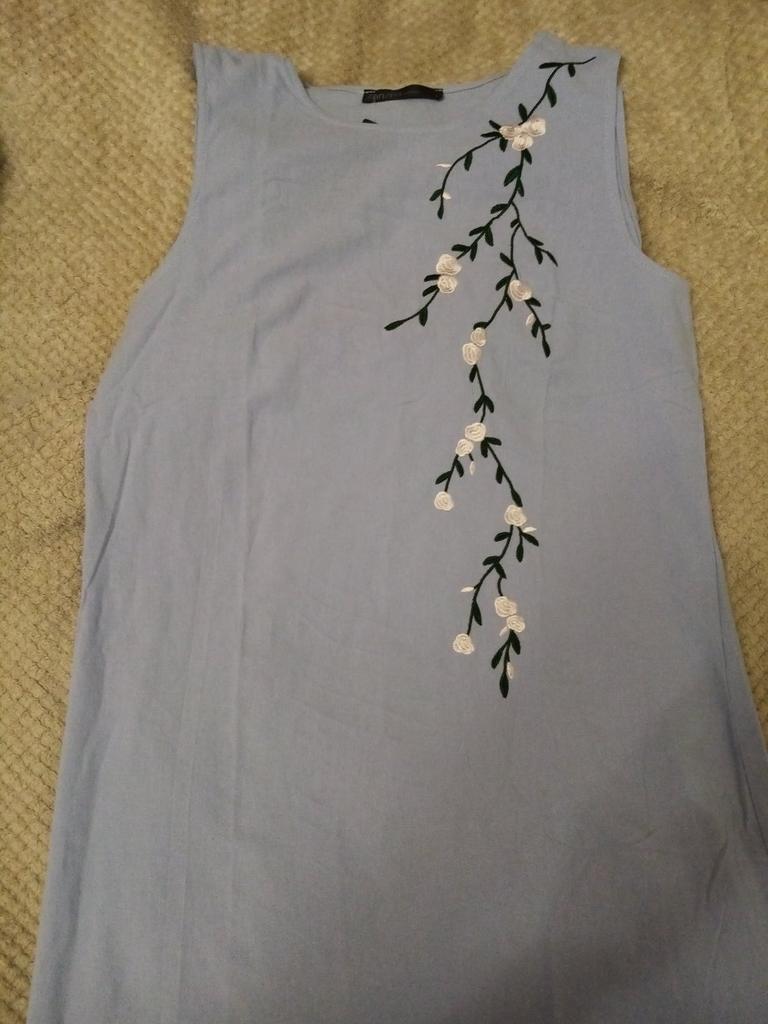 Sehr schönes Kleid! Natürlicher Stoff, sanfte blaue Farbe, gestickte weiße Blumen. Sauber genäht. Ich empfehle