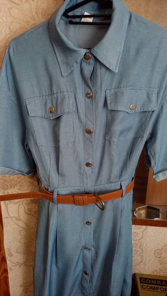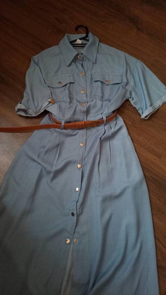 Im Allgemeinen entspricht es dem Foto, blauer Stoff mit Glanz, 42 UKR, Größe M genau richtig.
