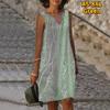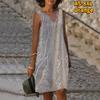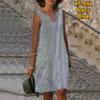 Frauen V-ausschnitt Sommer Silber Glitter Print Kleid Casual Ärmellose Mode Lässig Lose Sexy Kleider Plus Größe XS-8XL