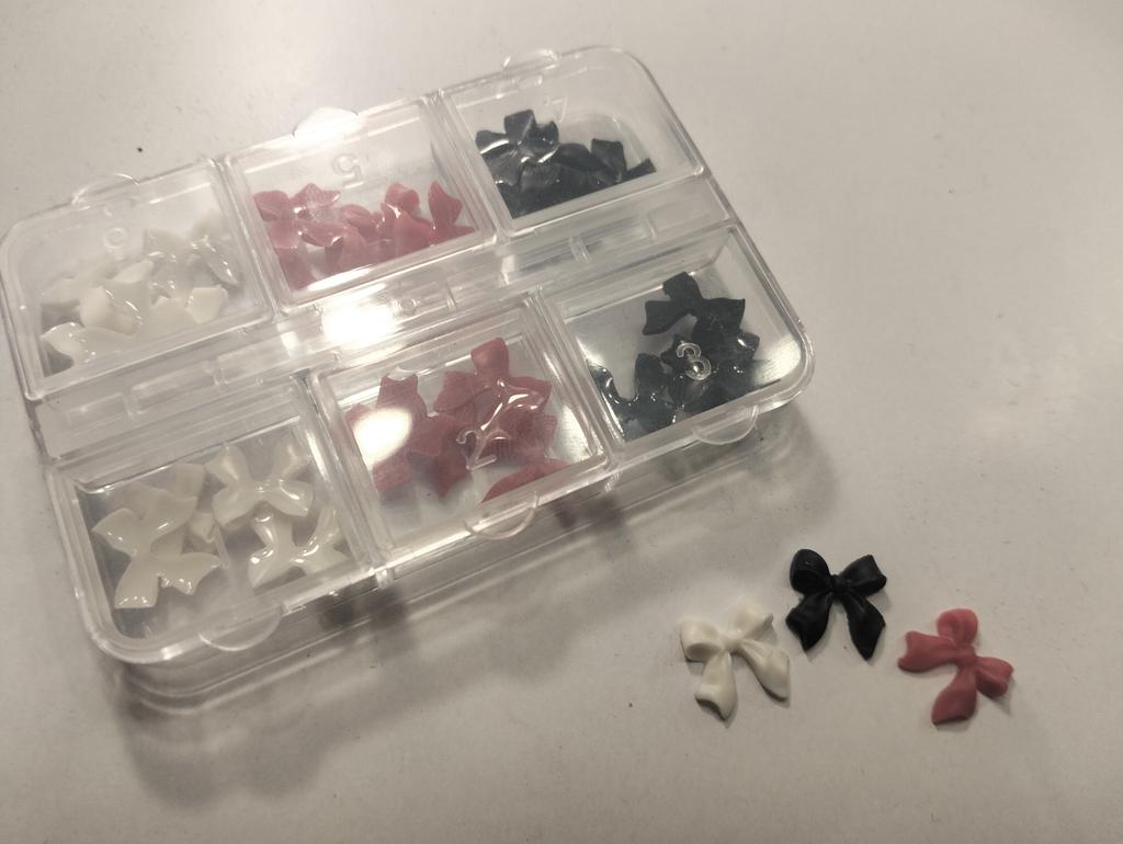 🎀Die Schleifen sind matt, es gibt 5 Schleifen in jeder Zelle, 6 Farben (Schwarz, Weiß, Beige, Blau, Lila und Rosa), sie sind etwas nicht sauber verarbeitet, aber das ist kein Grund zur Sorge, Sie können sie damit feilen eine Nagelfeile und alles wird gut, aber ich empfehle es. 🎀