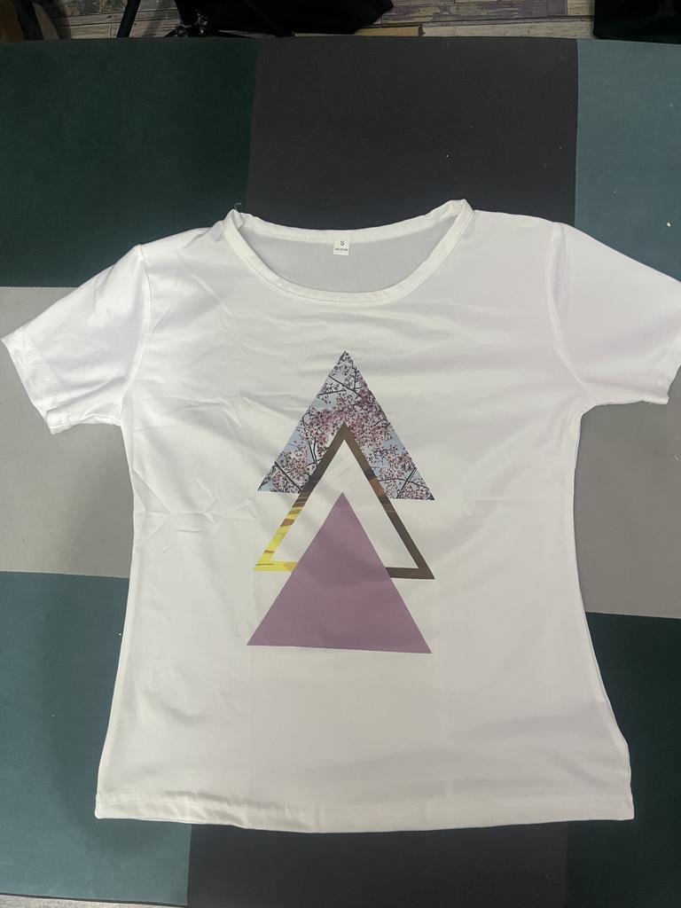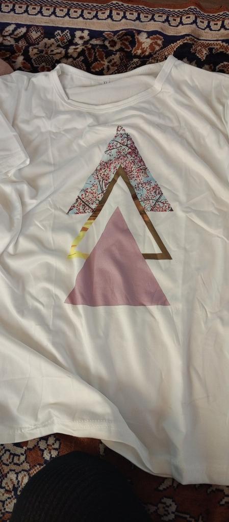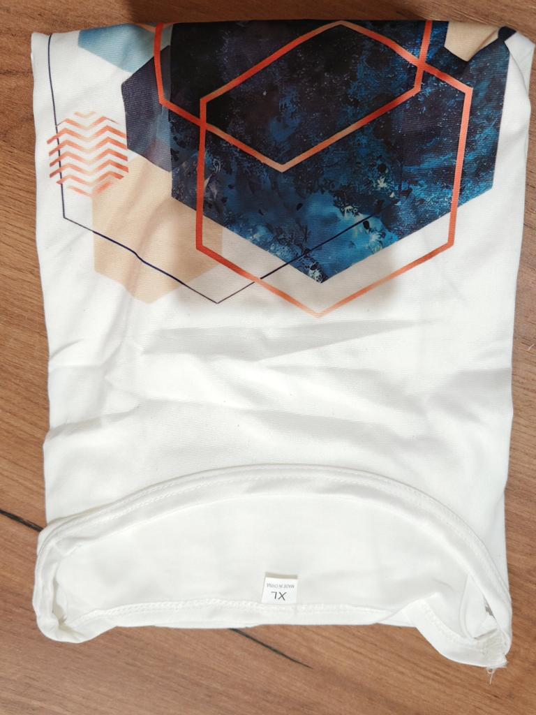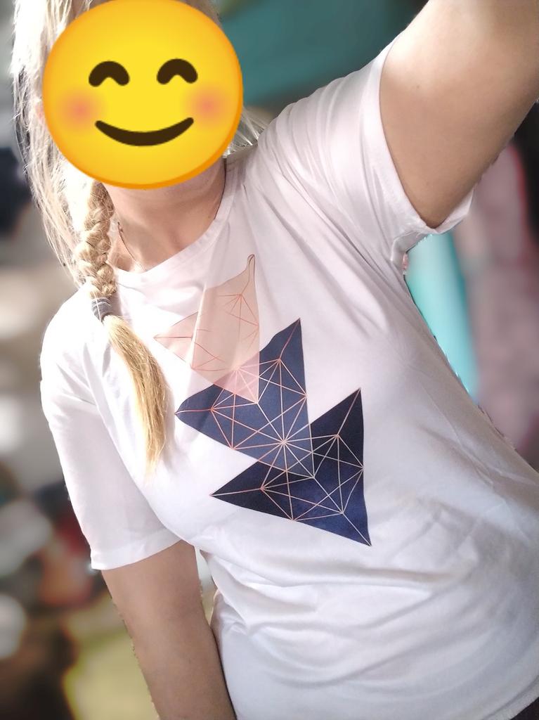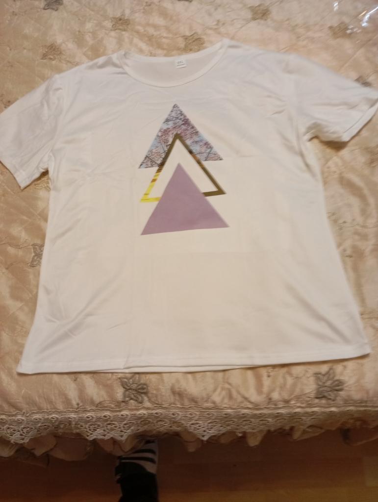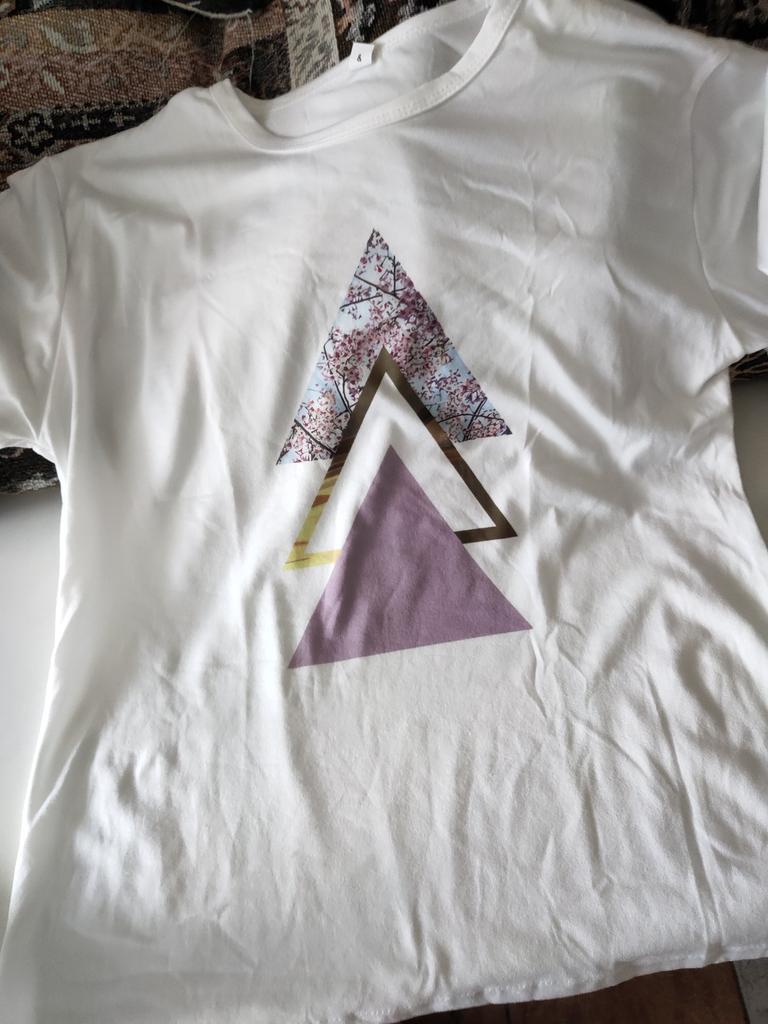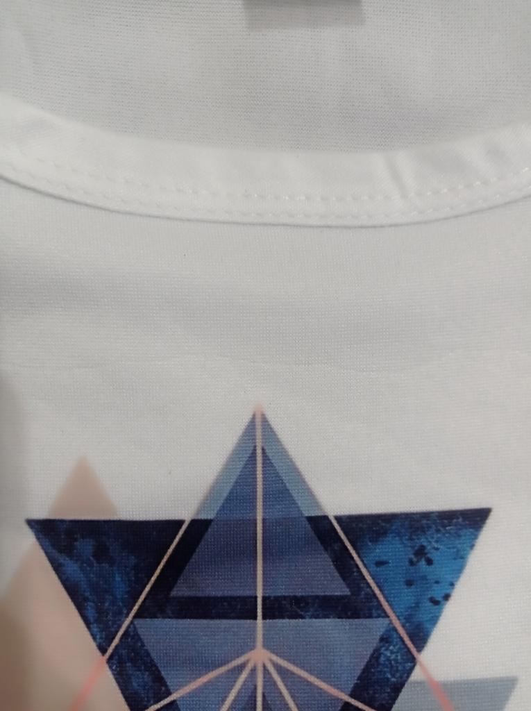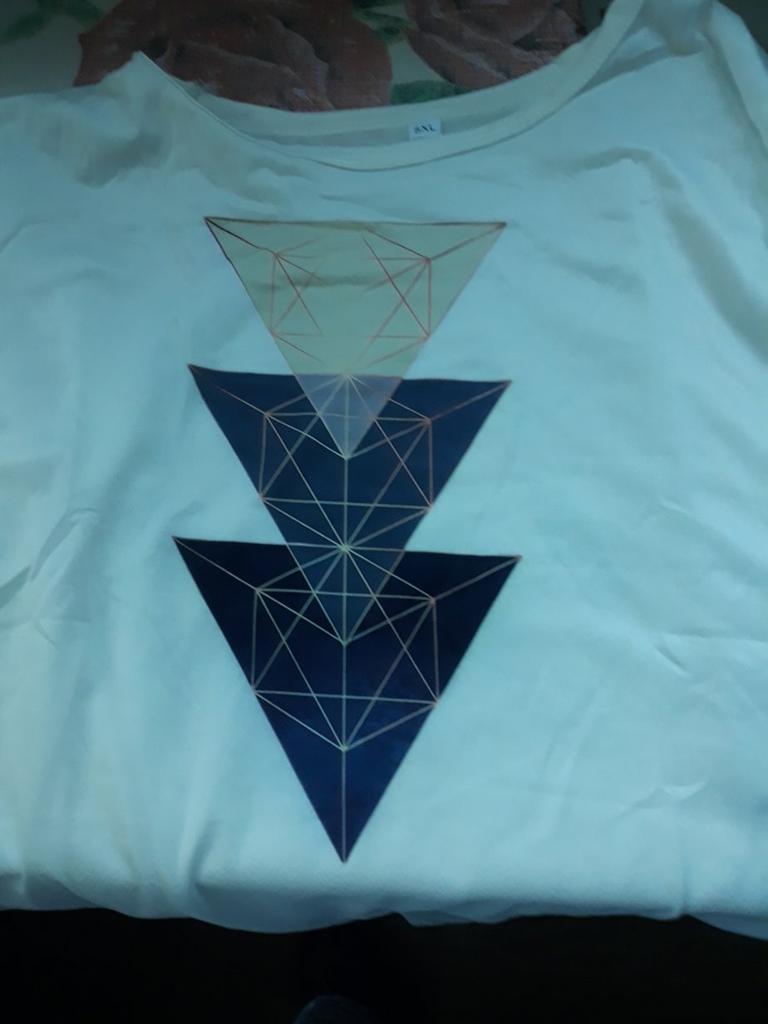 Das T-Shirt ist ganz gut, passt von der Größe. Aber die Farbgebung ist anders als auf dem Foto. In der Realität ist das obere Dreieck olivgrün (nicht rosa) und es gibt 2 blaue Dreiecke. Blasser als auf dem Bild