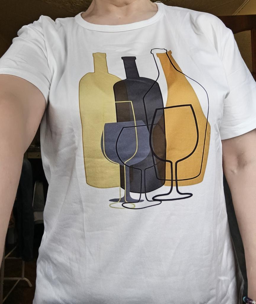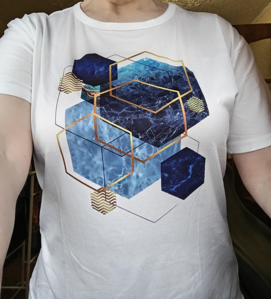 Auf dem Foto wurde das T-Shirt so ausgebreitet, als hätte es einen anderen Schnitt - mit einem schrägen, weiten Ärmel. In Wirklichkeit ist der Ärmel schmaler und der Schnitt anders. Aber ansonsten ist es in Ordnung, deshalb ziehe ich einen Punkt leicht ab.