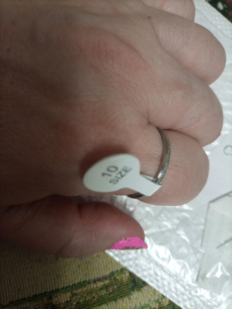 Der Ring der Größe 10 ist etwas größer als ich erwartet hatte. EIN wenig groß. Ich trage es gerne.