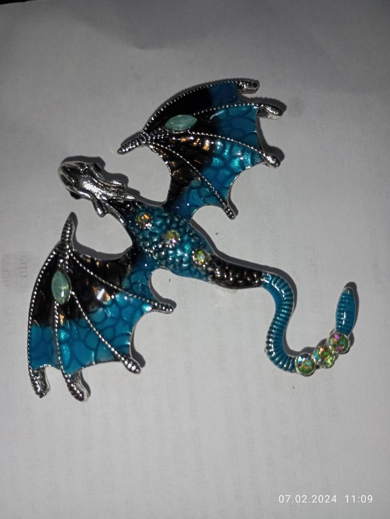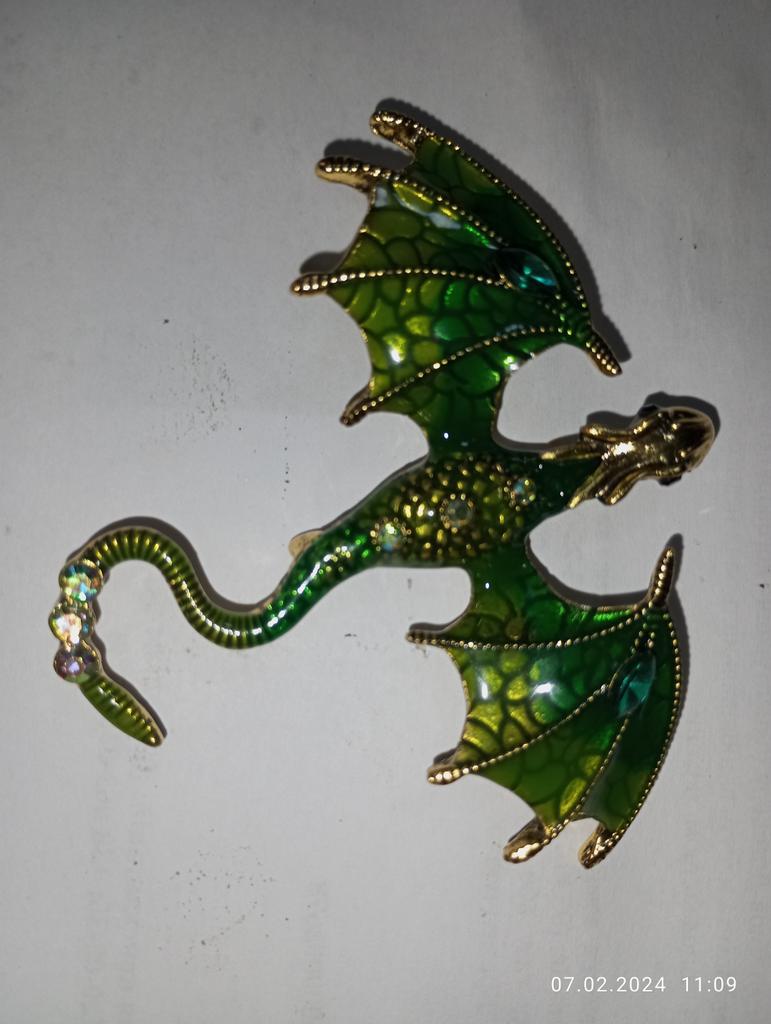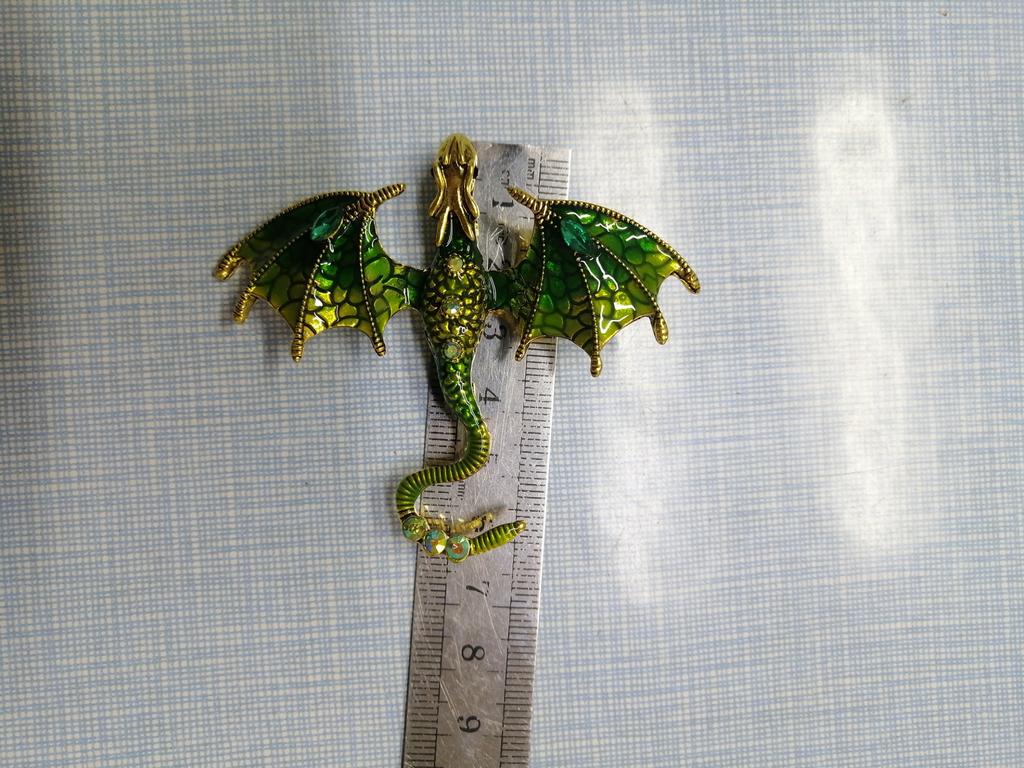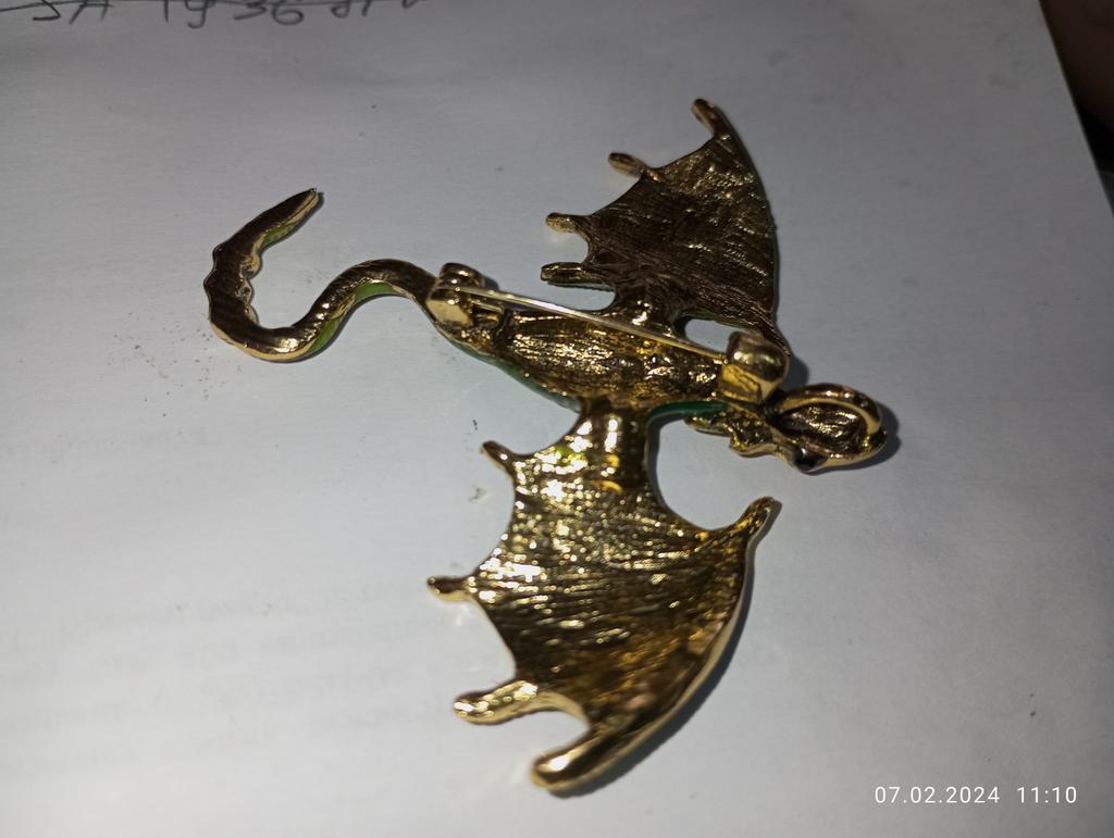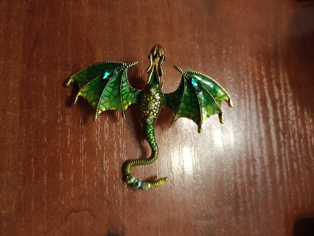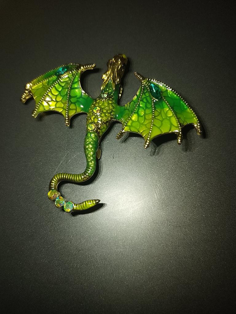 Schöne hochwertige Verarbeitung. Der Körper besteht aus hartem, massivem Metall, die Farben sind intensiv und glänzend – auf den Flügeln sieht es aus wie Emaille, die Steine sind aus geschliffenem Glas. Dank des Lochs im Drachenkopf kann die Brosche auch als Anhänger verwendet werden.