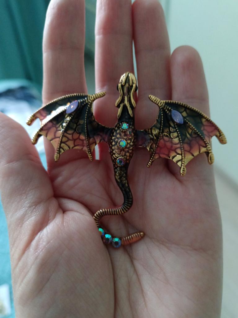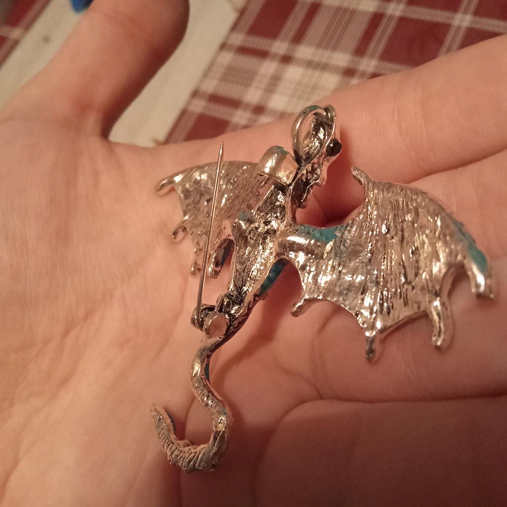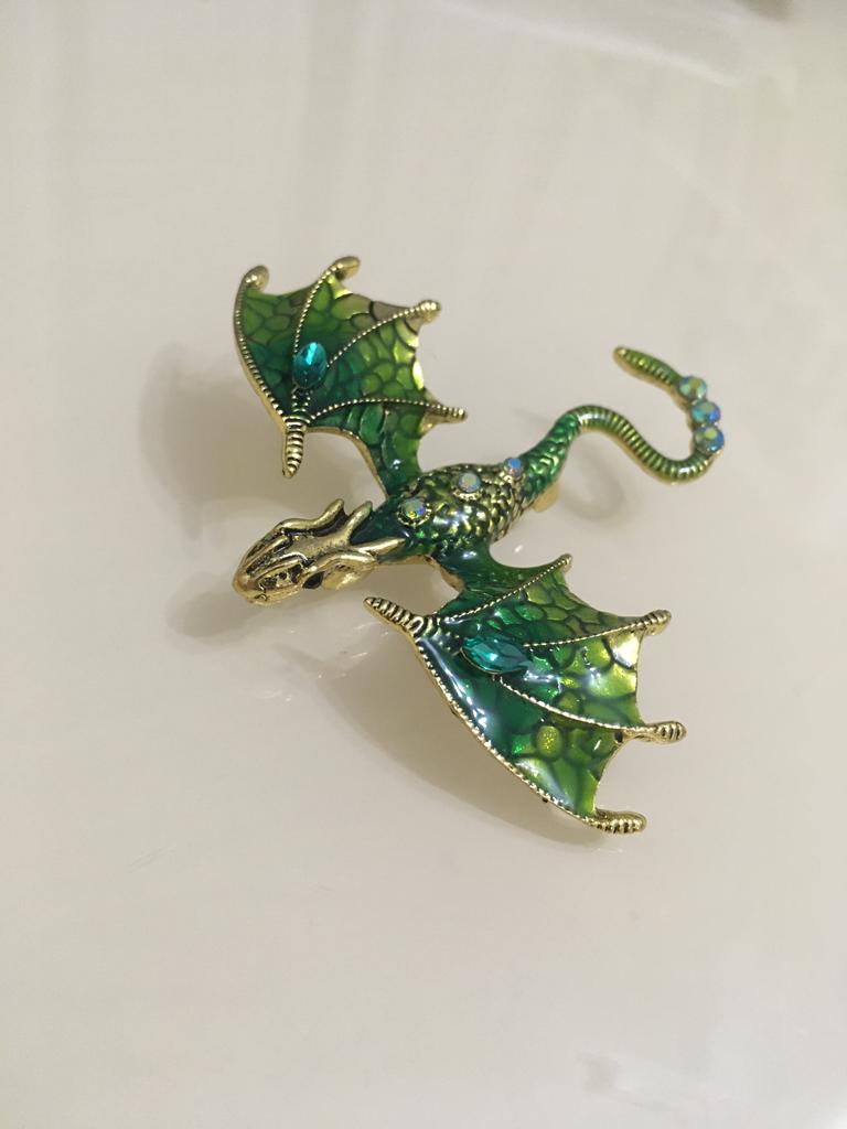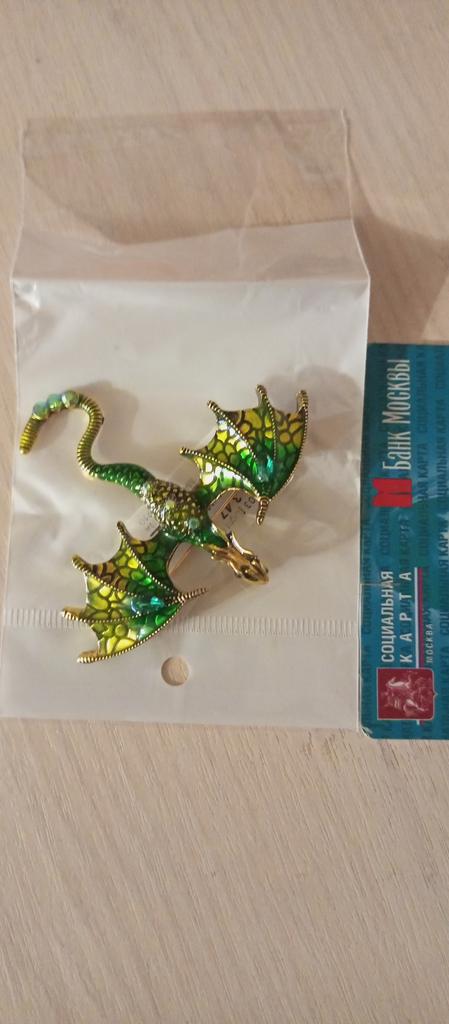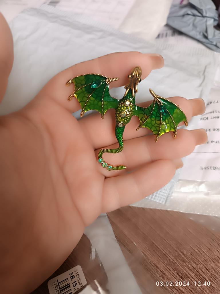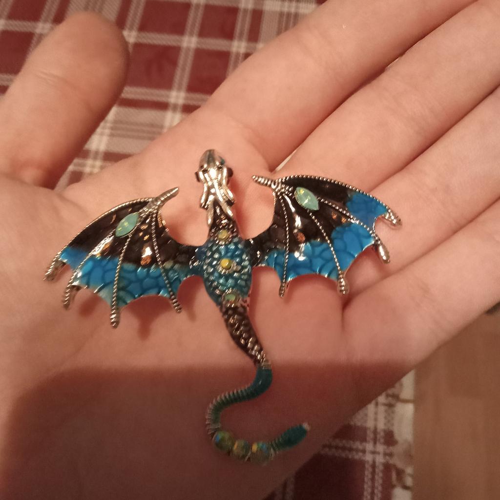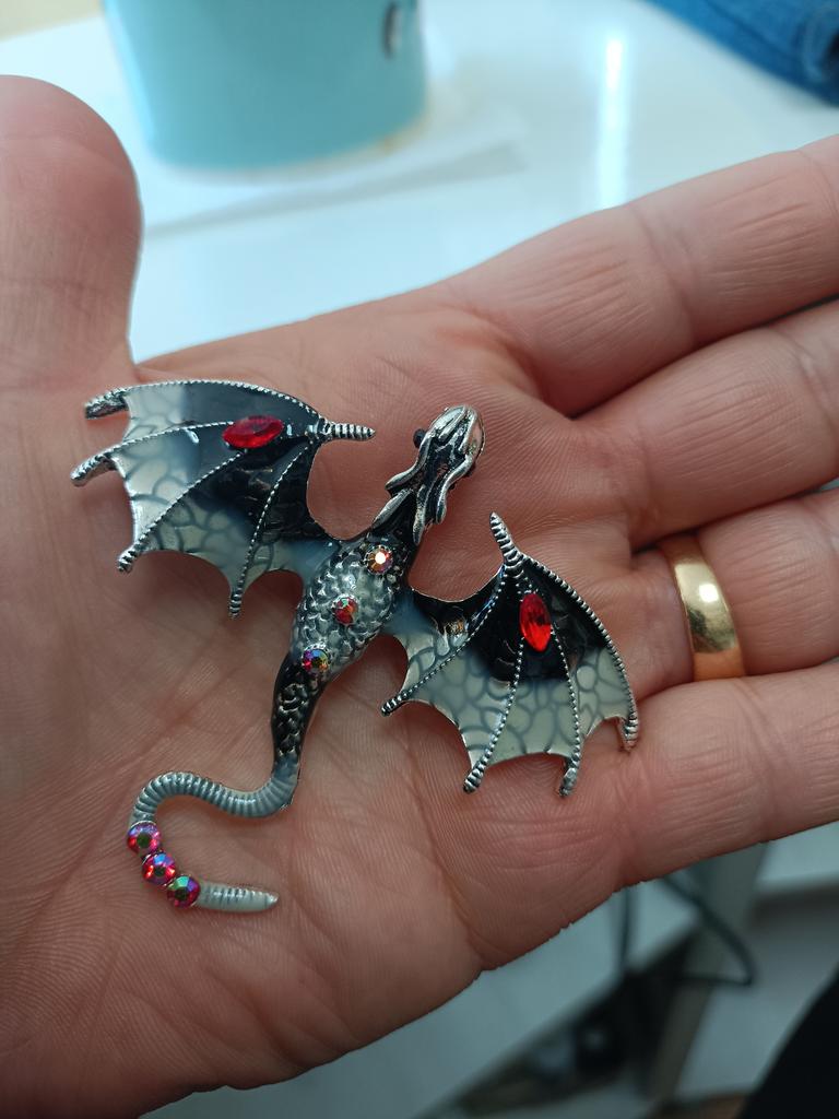 Schöne hochwertige Verarbeitung. Der Körper besteht aus hartem, massivem Metall, die Farben sind intensiv und glänzend – auf den Flügeln sieht es aus wie Emaille, die Steine sind aus geschliffenem Glas. Dank des Lochs im Drachenkopf kann die Brosche auch als Anhänger verwendet werden.