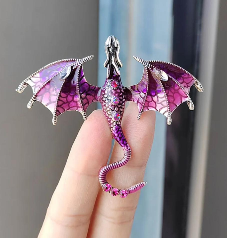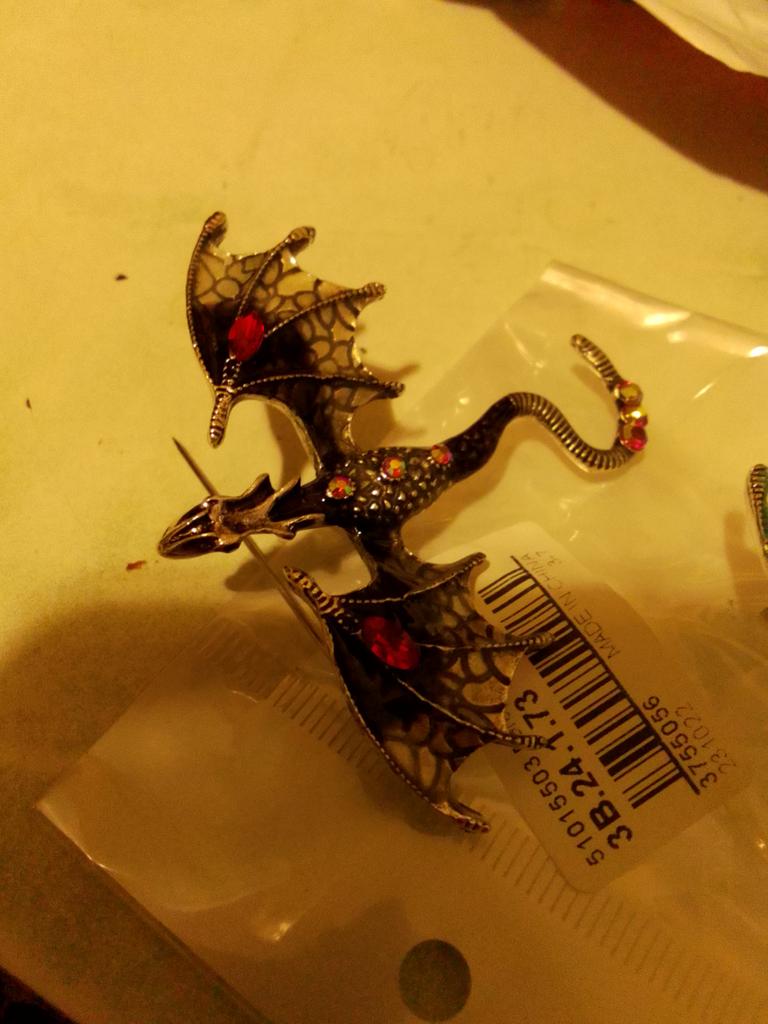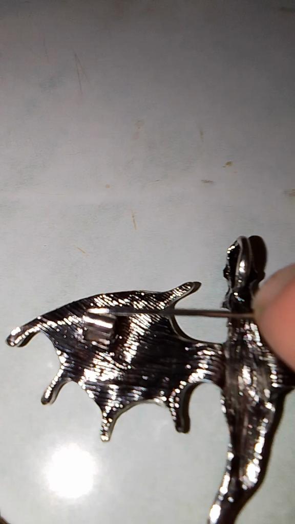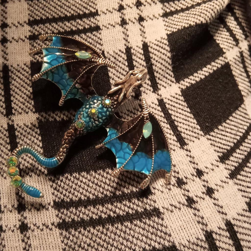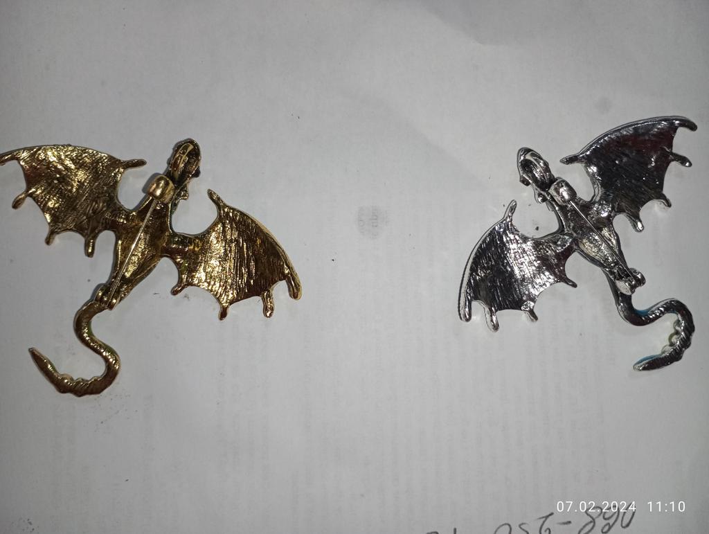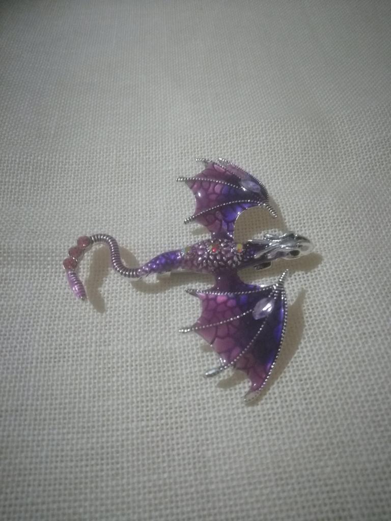 Schöne hochwertige Verarbeitung. Der Körper besteht aus hartem, massivem Metall, die Farben sind intensiv und glänzend – auf den Flügeln sieht es aus wie Emaille, die Steine sind aus geschliffenem Glas. Dank des Lochs im Drachenkopf kann die Brosche auch als Anhänger verwendet werden.