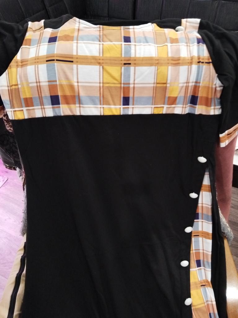 Überhaupt nicht wie auf dem Foto. Sehr dünn, durchscheinend. Passt bei Größe 50, sitzt nicht eng. Der Ärmel ist nicht kurz. Länge 15 cm über dem Knie
