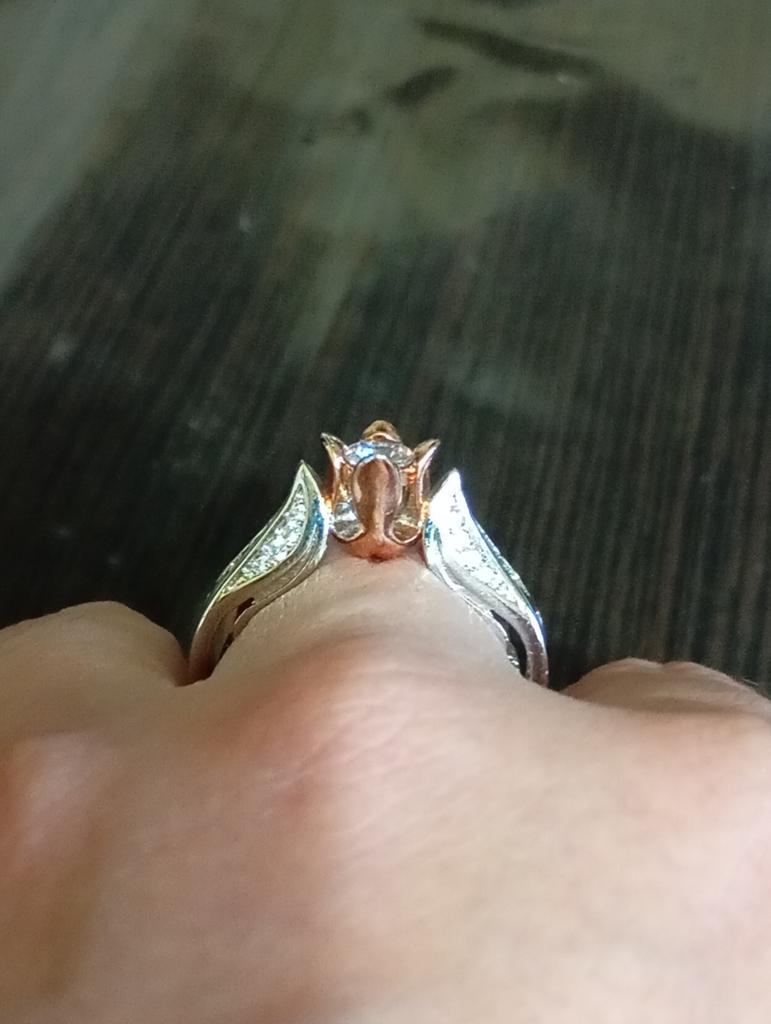 Wenn man den Ring von oben betrachtet, sieht er ganz nett aus, die Steine sind sauber eingefasst. Doch der Umfang des Rings selbst ist ein Graus – wie eine dicke Mutter auf einer Schraube. Sehr dicke Seiten- und Bodenwände des Rings. Zudem ist unten ein hervorstehender Kegel vorhanden, der für die Hand unangenehm ist. Und der Ring selbst wirkt einfach riesig, er sieht an der Hand nicht gut aus. Und der rosa Metallzylinder - die Blume sieht von der Seite hässlich aus, sie ist zu groß. Und das ist kein Silber!!!