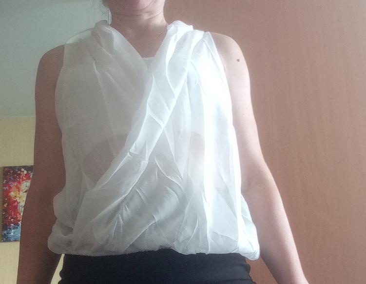 Ein sehr interessantes Modell, aber man hat am Material gespart. Es ist wirklich eine Weste, da der Chiffon nur auf der Vorderseite ist. Die Baumwollrückseite beeinträchtigt den Look ein wenig, ist aber für diesen Preis akzeptabel.)