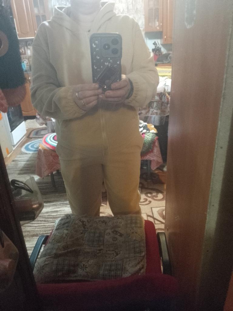 Meine Größe ist 50, ich habe XL genommen, passt ausgezeichnet, habe die Farbe Khaki genommen, aber sie ist sandfarben hell, für mich nicht entscheidend, da ich den Anzug für zu Hause für den Herbst genommen habe, weich, gemütlich.