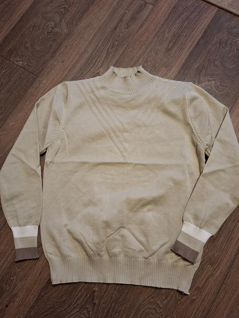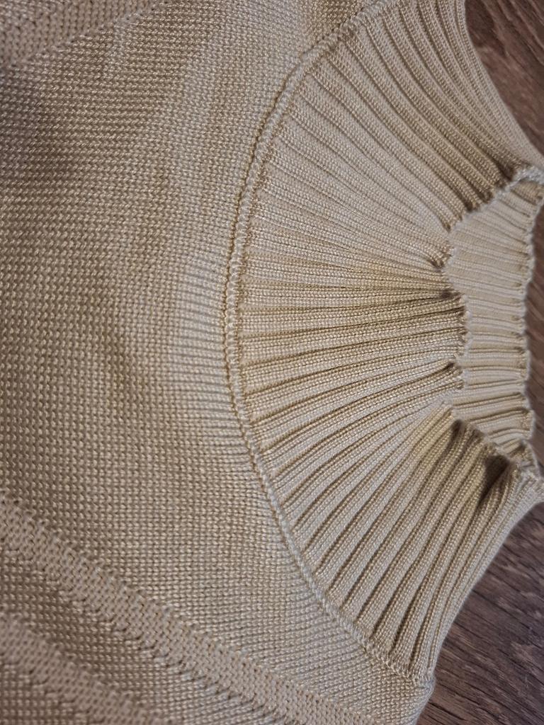 Auf dem Foto ist der Pullover warm mit einem Flaum, aber in Wirklichkeit glänzt er, als wäre er aus Glas. Sowohl am Kragen als auch an den Ärmeln endet das Bündchen mit einer Rüsche.