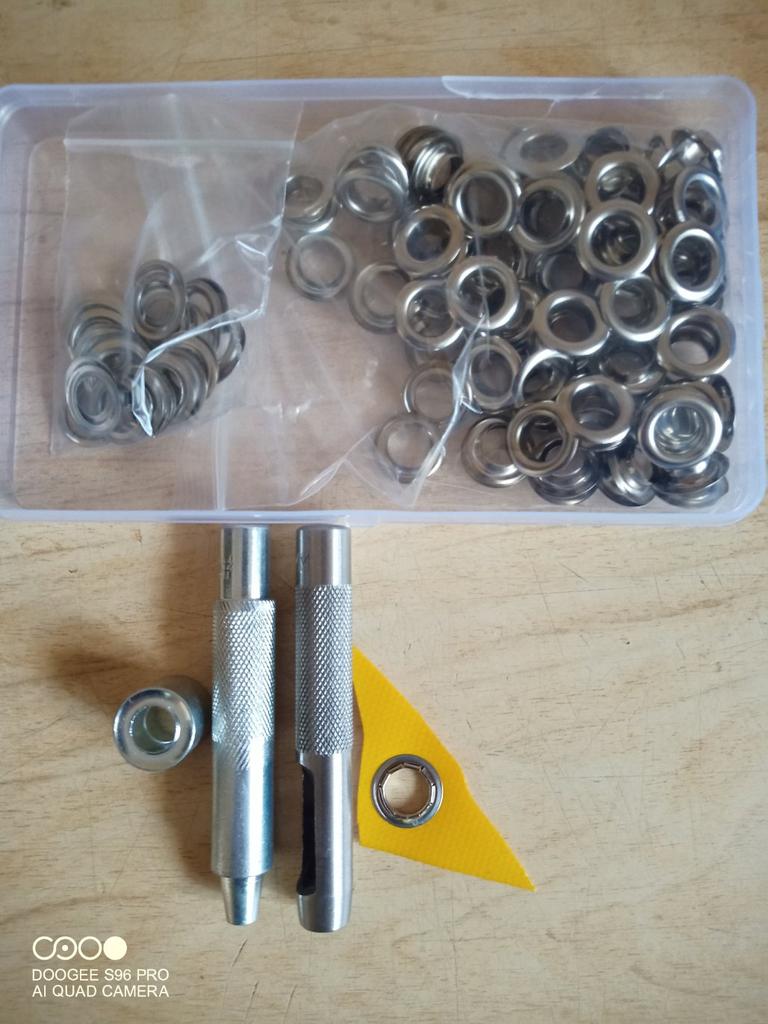 Entwickelt für eine einfache Handhabung, stanzen Sie einfach mit dem mitgelieferten Werkzeug ein Loch in den Stoff und markieren Sie die Position. Führen Sie dann den Augenknopf in das Loch ein und decken Sie ihn mit einer Dichtungsabdeckung ab. Um die Öse zu befestigen, klemmen Sie das gesamte Loch zwischen das Schlagwerkzeug und den Sockel und schlagen Sie es mit einem Hammer fest.