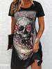 Damenmode, locker, lässig, kurzärmelig, mit Totenkopf-Motiv, schulterfrei, sexy Minikleid, Übergröße