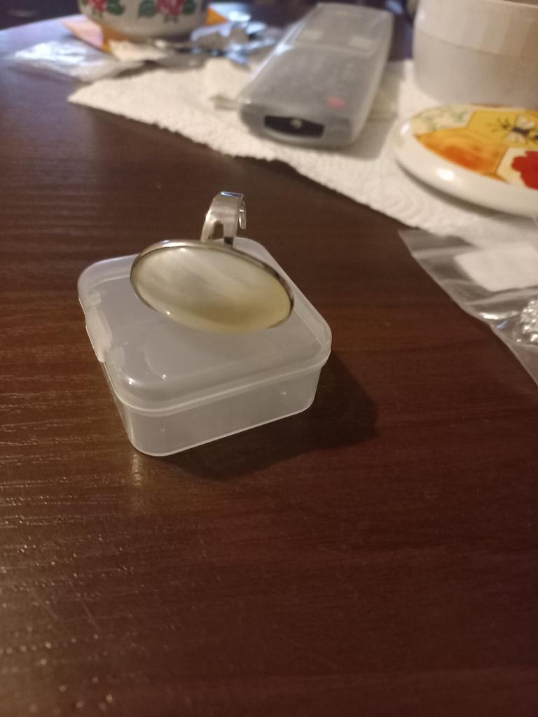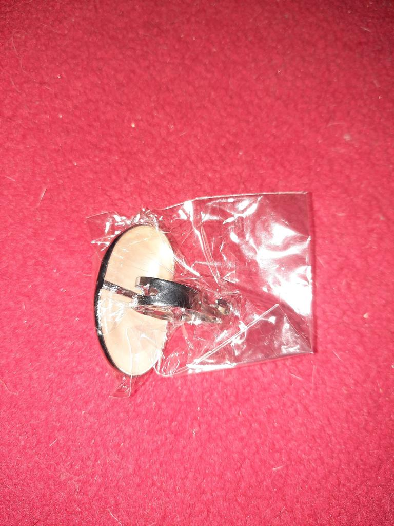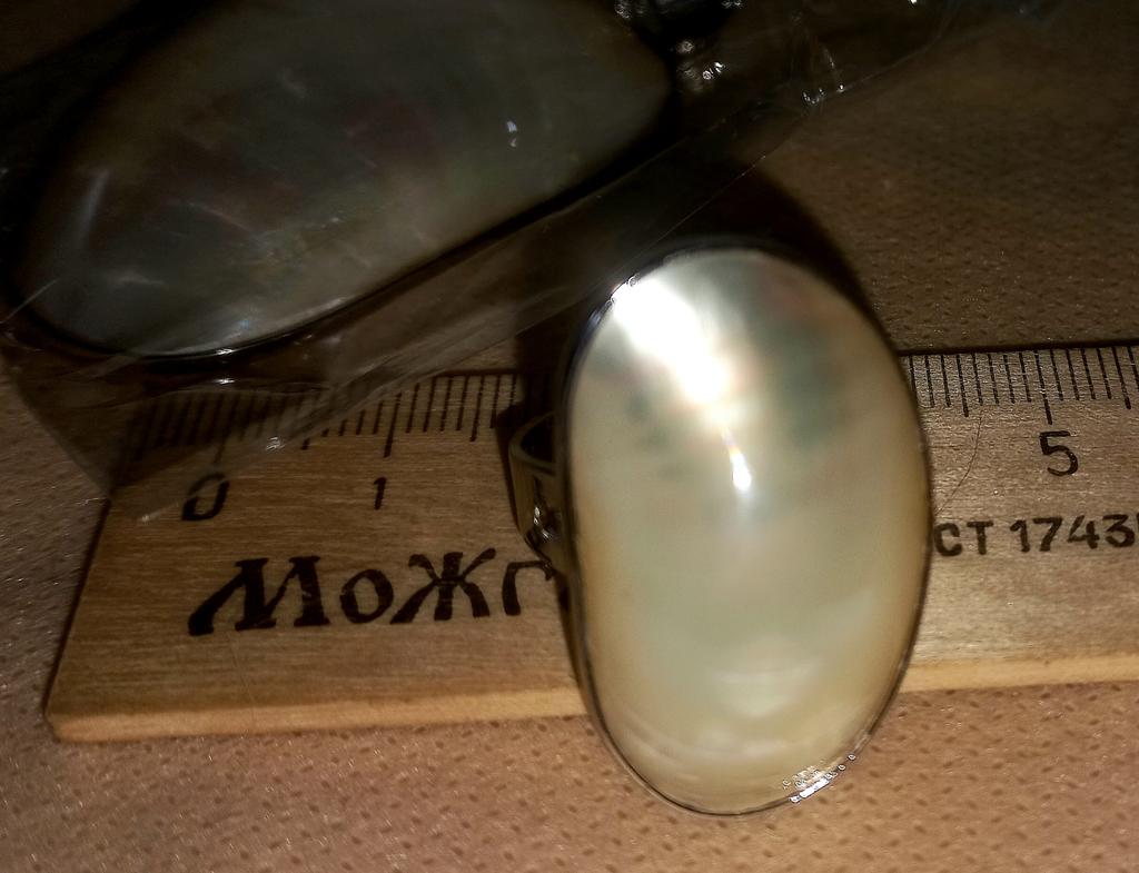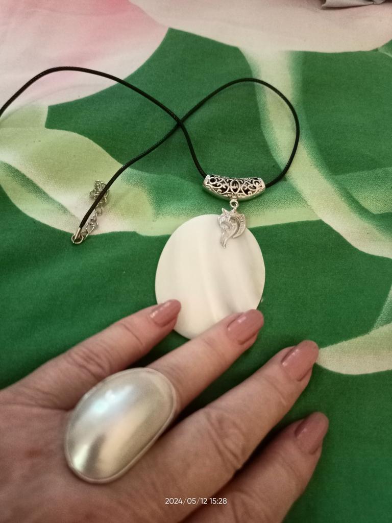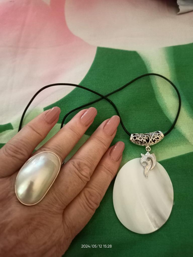 Oben ist es cool, an der Seite seltsam – ein geteilter Ring mit einer Lücke in der Mitte. Die Oberseite besteht aus 2 verklebten Perlmuttschichten, sehr leicht. In Begleitung des Anhängers.