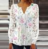 Mode Langarm V-ausschnitt Frau Spitze Blosue Tops Solide Aushöhlen Plissee Vintage Print Blusen Frauen Casual Weißes Hemd 25958