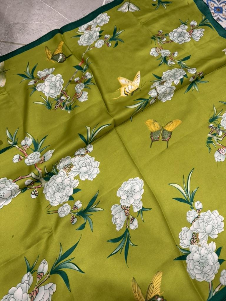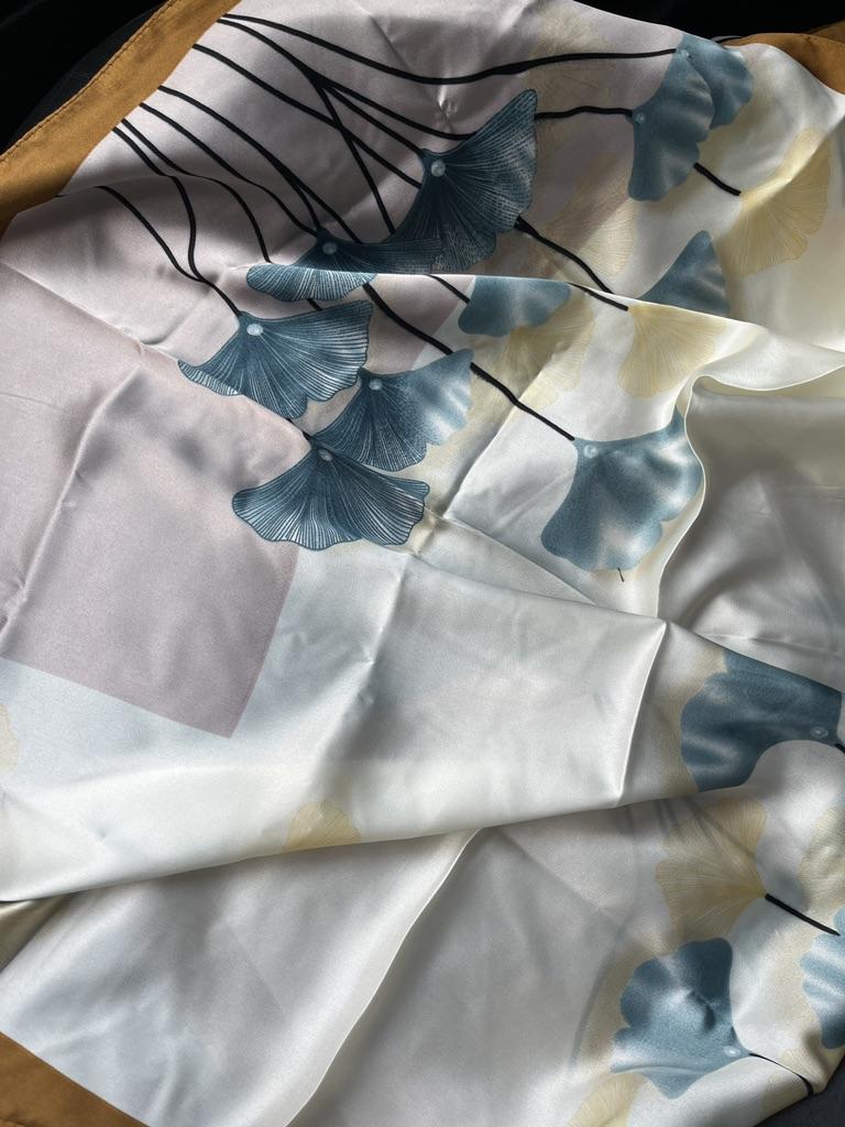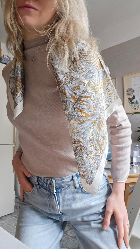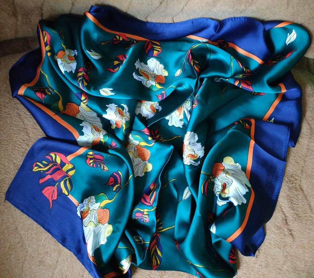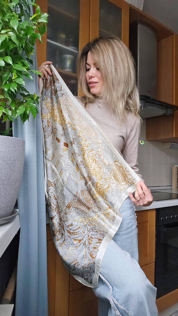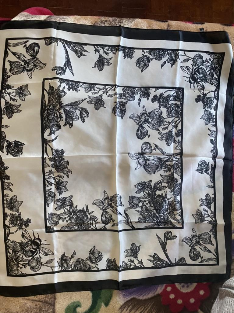 Der Schal ist aus Seide, er rutscht vom Kopf, es gibt keinen Freund für den Geschmack und die Farbe