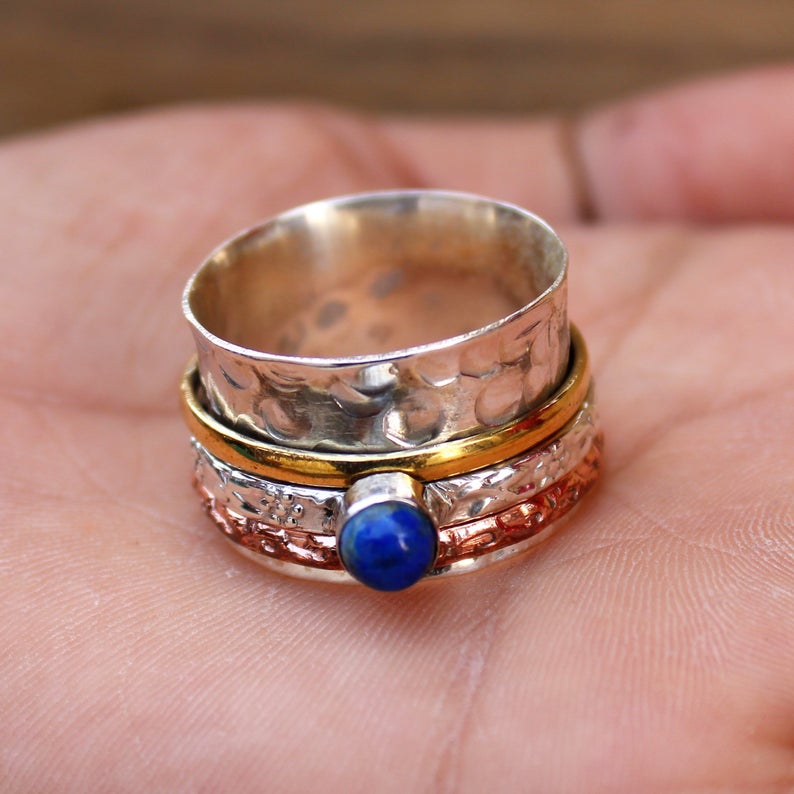 Lapislazuli-Spinnerring, massiver 925er Sterlingsilber-Fidget-Ring, gehämmerter Meditationsring, Angst-Sorgen-Ring, Weihnachtsgeschenk, Valentinstagsgeschenk,
