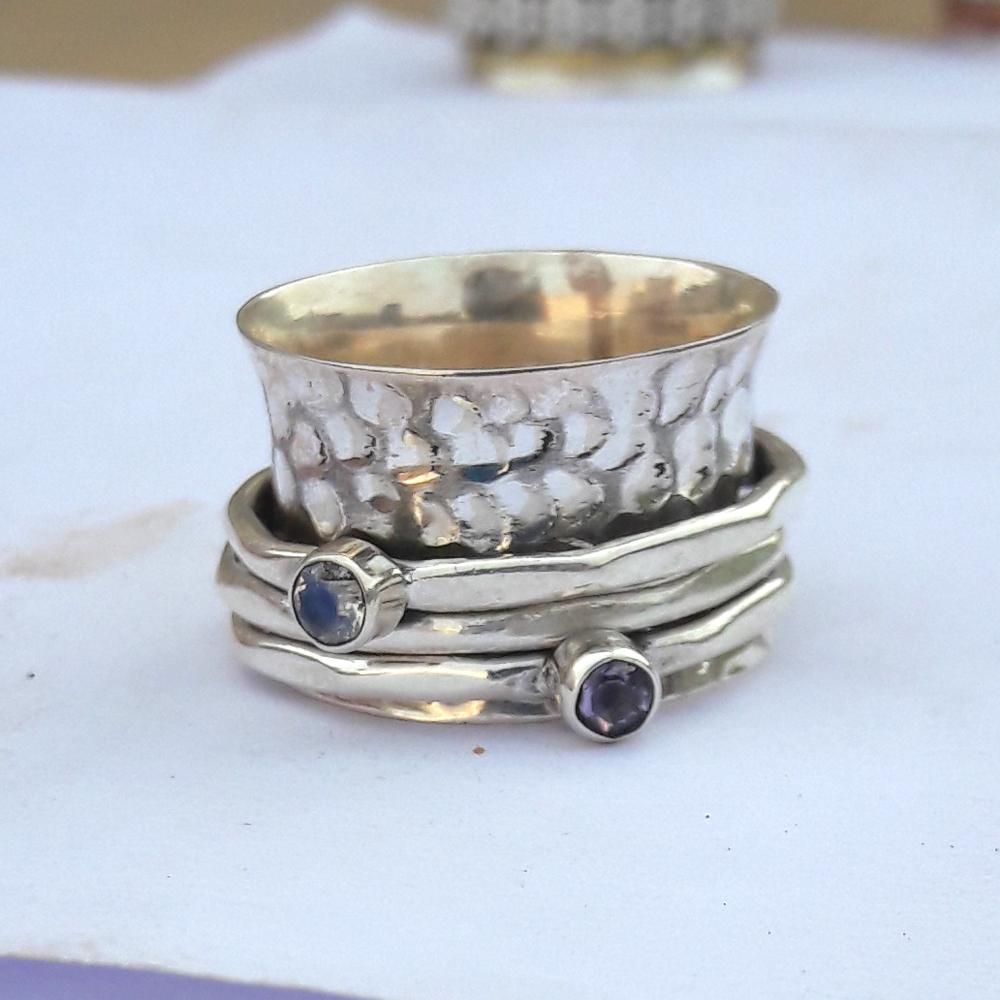 Mondstein & Amethyst Silber Spinnring, Herz Spinner Ring, 925 Sterling Silber Ring, gehämmerter Ring, Angstring, Sorgen-Fidget-Ring, Geschenk für Sie