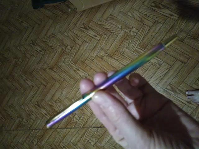 Der Griff ist zierlich, regenbogenfarben. Ich werde ihn in meiner Handtasche tragen.