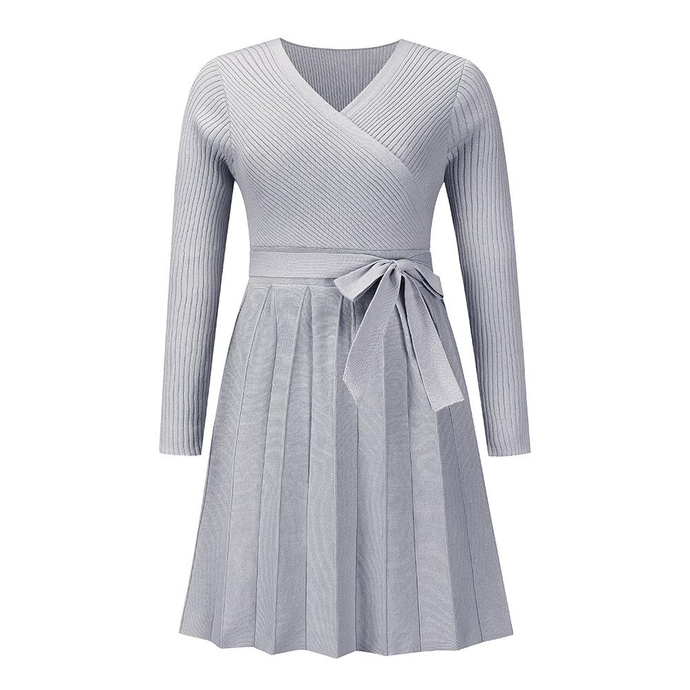 Herbst und Winter Damen Pullover Kleid Sexy V-Ausschnitt Plissee Strick Kurze A-Linie Kleider