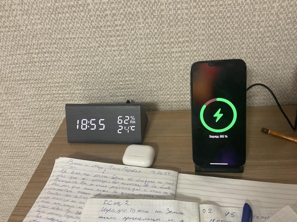 Funktioniert alles einwandfrei. Ich habe so ein chinesisches Teil, da ist das Telefon nach 20 Minuten heiß wie dein Spiegelei. Darauf kann man wirklich etwas braten. Deshalb habe ich daran das originale MagSafe angeschlossen. Hier liegt es eine Stunde und ist im normalen Zustand. Es lädt langsam, aber ich brauche keine Schnellladung, dafür gibt es das Kabel! Übrigens, man hört es ein bisschen (wenn man das Ohr hinhält). Und das ist okay, dafür laden bei mir zwei Geräte über eine Steckdose.